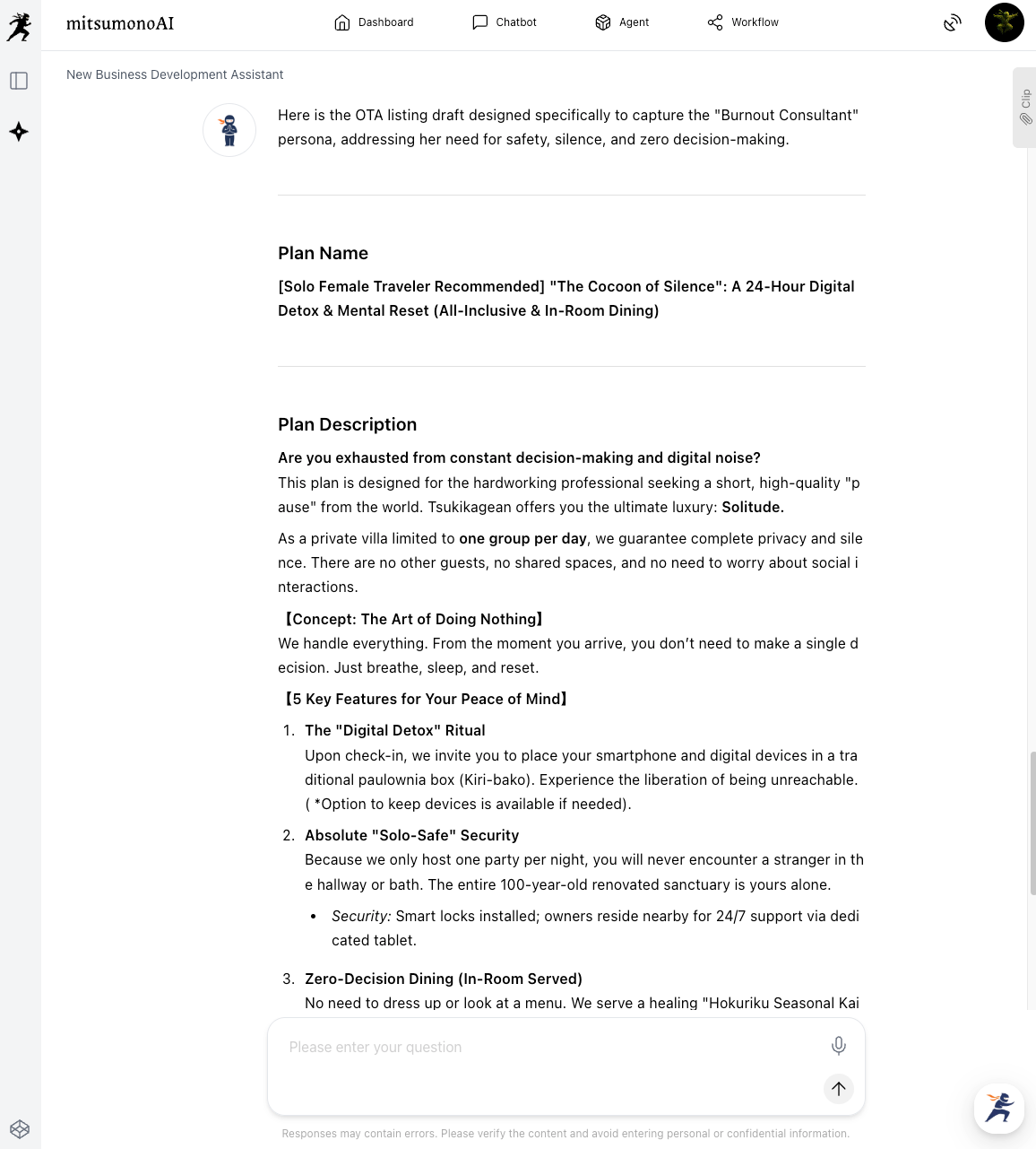 Finally, use the "New Business Development Assistant" to plan a specific stay package that resonates with the identified target.