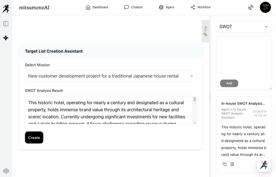 Paste the SWOT analysis results saved in Step 1 and click "Create."