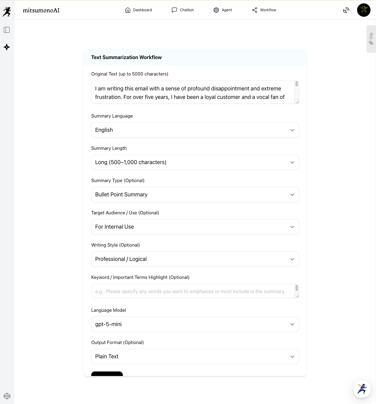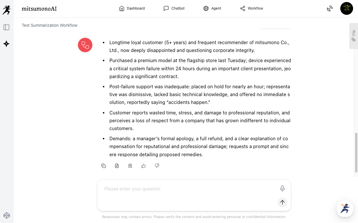 Let’s walk through creating a primary summary using the Text Summarization Workflow on mitsumonoAI, using a hypothetical long-form complaint email received recently.