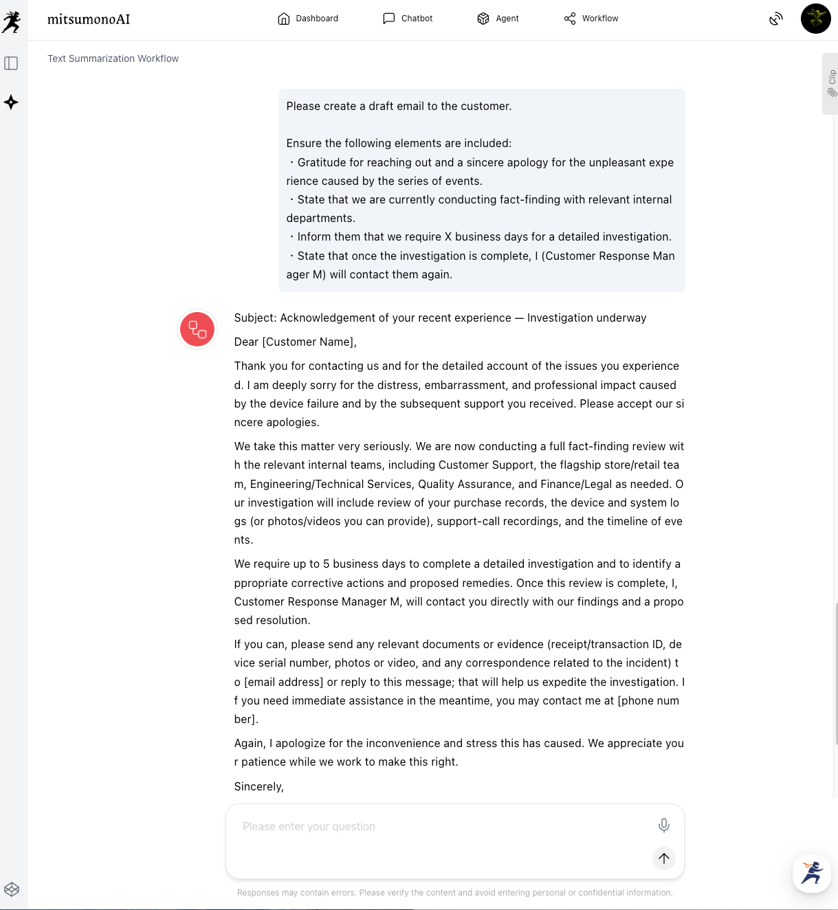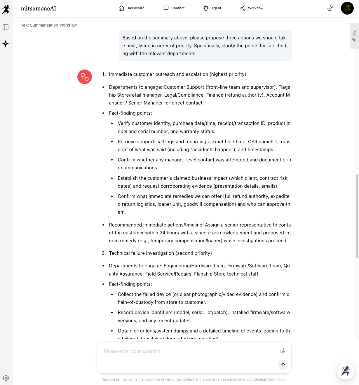 Once the objective facts are organized, the next step is to finalize the response strategy and make the initial contact with the customer. Ask the AI about the next actions to be taken based on the outputted summary.