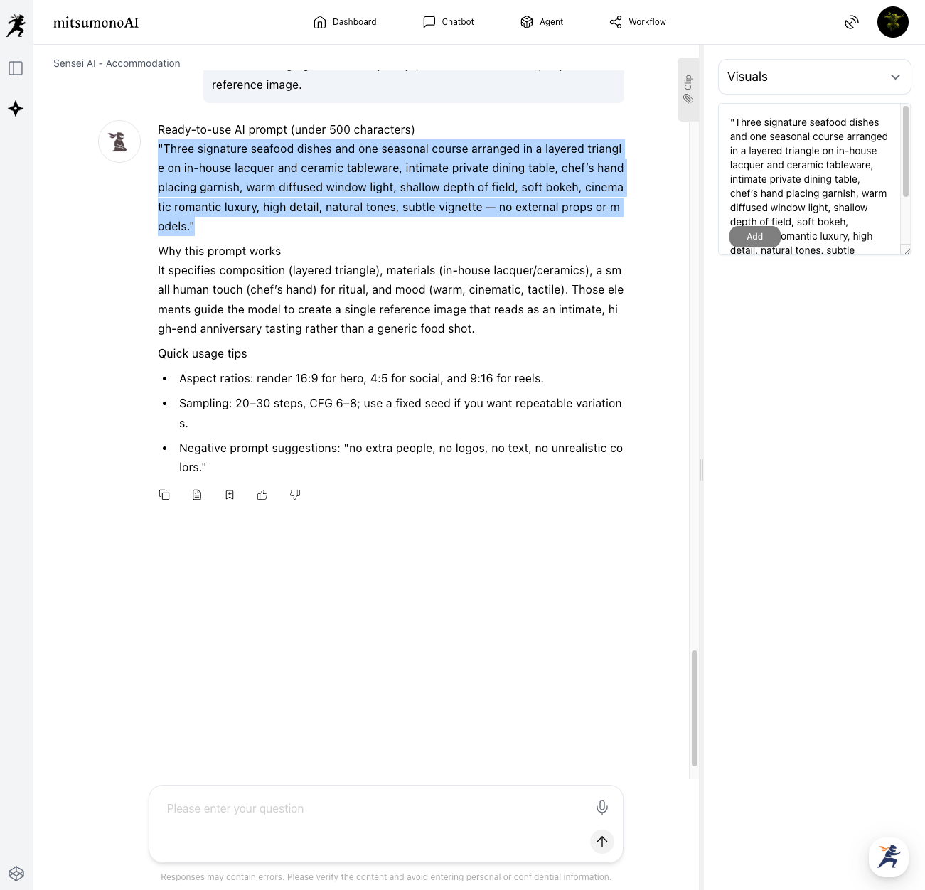Sensei AI will suggest specific visual guidelines, including "Composition," "Lighting," "Texture," and "Scene Setting." You determine the concept by answering questions from Sensei AI or providing information about your ryokan, as shown below.