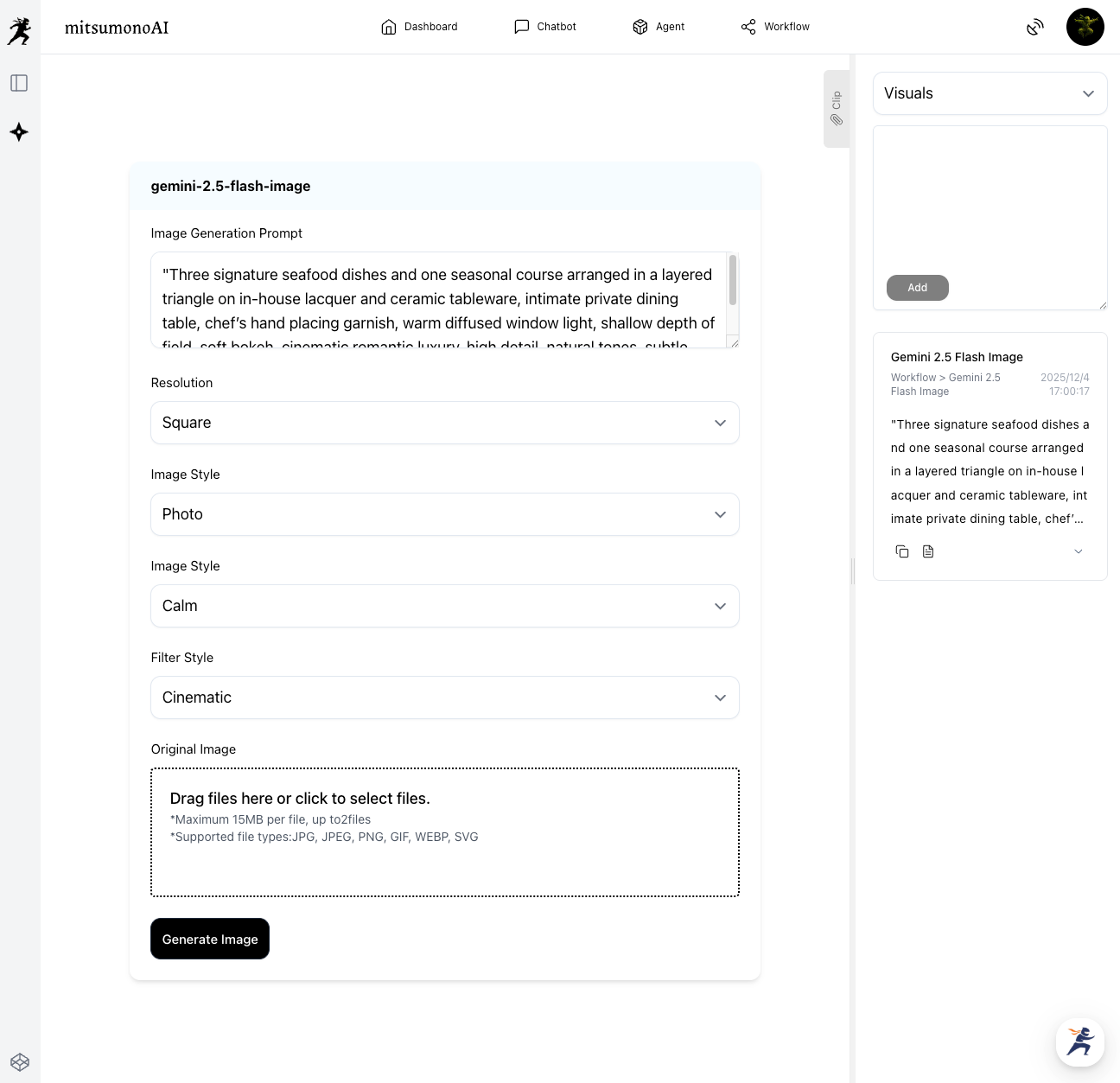 Additional Instruction: "Focus on the cuisine." This process allows you to confirm the concrete "picture" of the visual concept before the actual photoshoot, enabling pre-verification of composition and atmosphere.