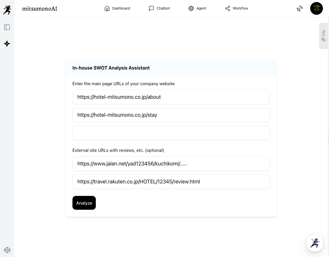 Enter the URL of your company's website and the URL of external sites where reviews are posted (e.g., travel booking sites). After clicking "Analyze," the SWOT analysis results will be output. Review the results and save them in the clip.