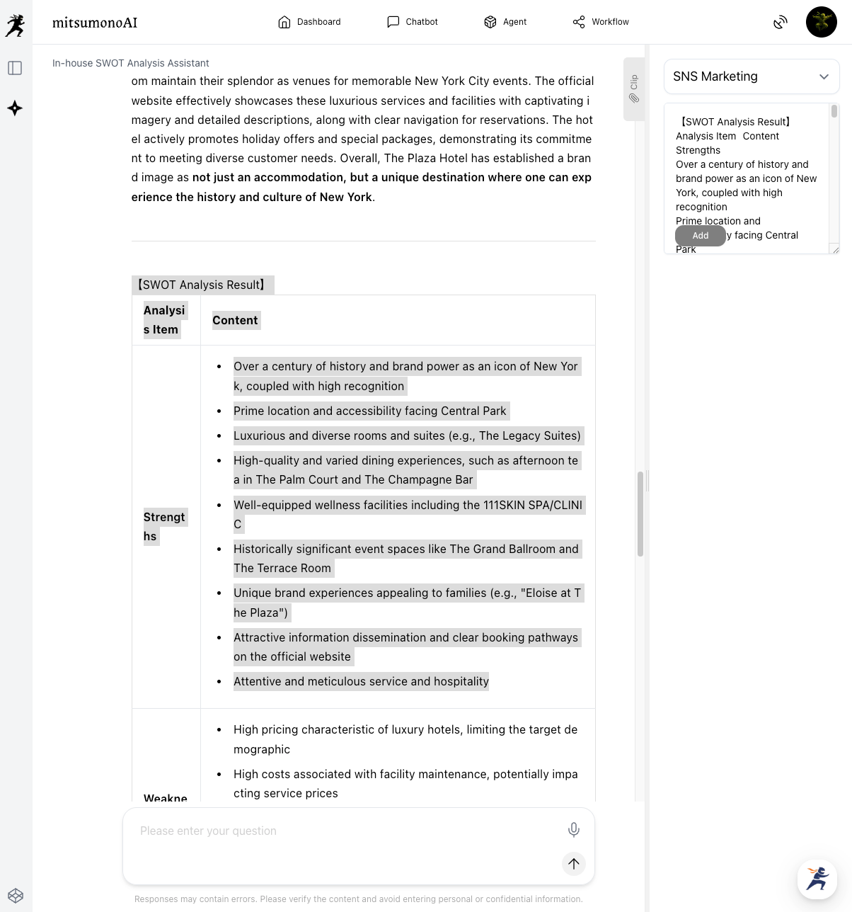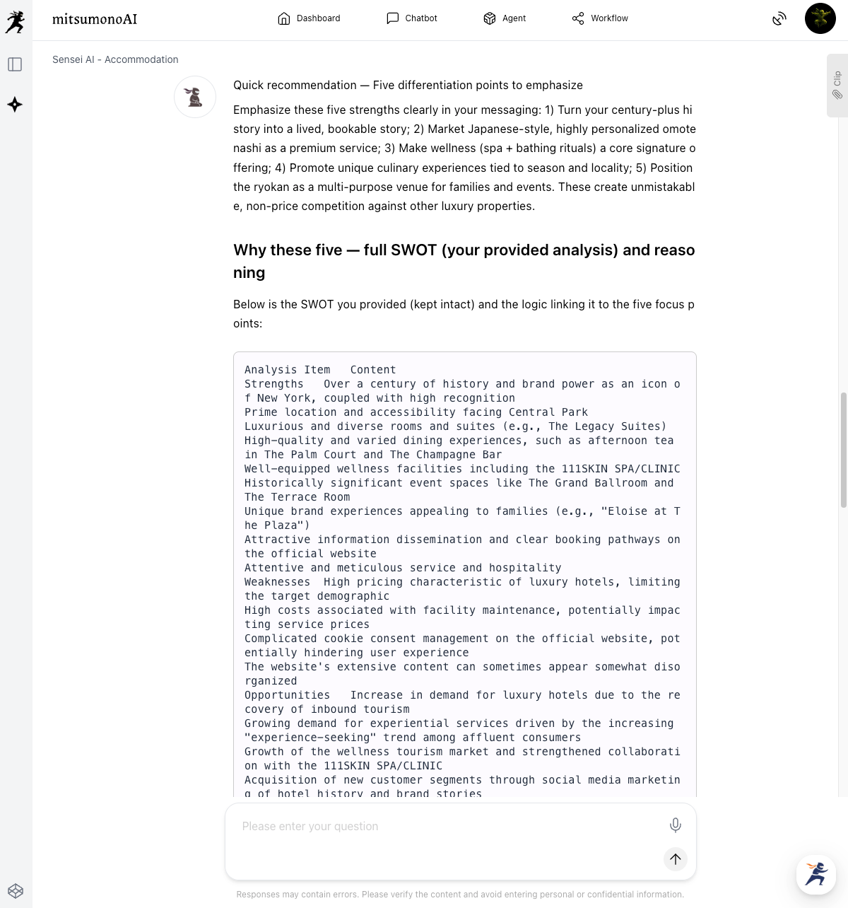 Once the chat screen appears, send the SWOT analysis results that you saved in the clip earlier. Sensei AI will extract unique differentiation factors based on its specialized knowledge of the accommodation industry and the analysis results.