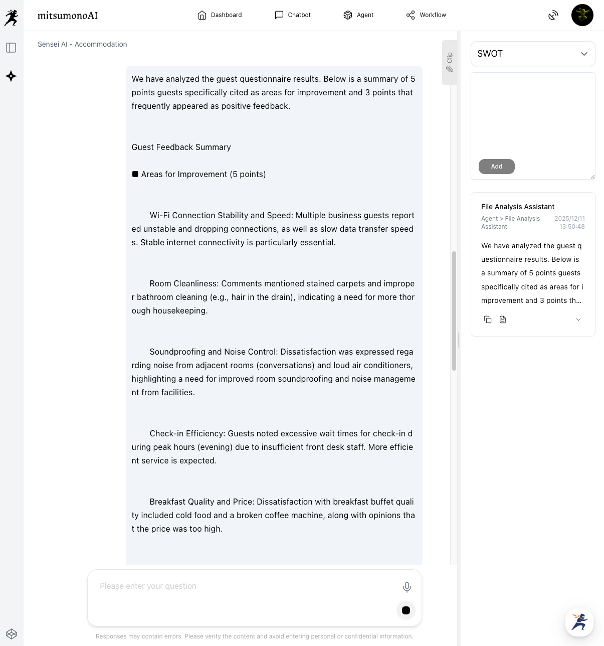 Furthermore, utilizing the specialized knowledge of Sensei AI provides deep insights into issues specific to the accommodation industry and concrete, feasible on-site measure proposals. This promotes data-driven decision-making that reflects the "authentic voice" of the customer in business strategy. As a result, it will contribute to increased customer loyalty, a higher repeat rate, and the acquisition of new customers.
