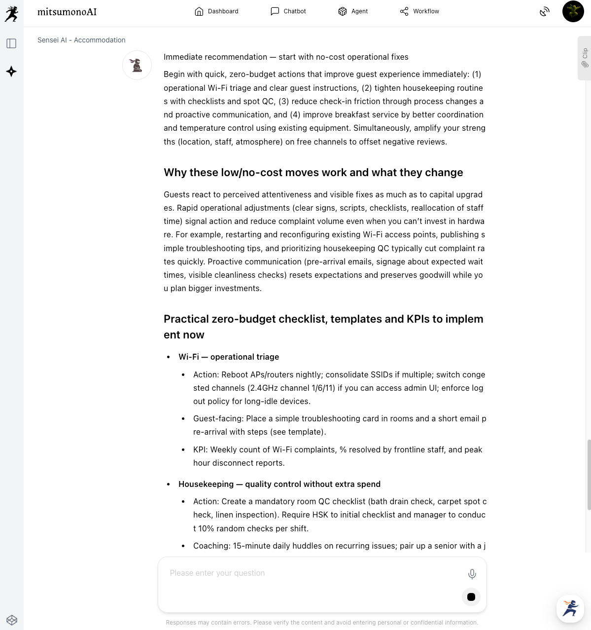 Then, send the information about the "areas cited as improvement points" that you saved in the clip earlier. Sensei AI will begin proposing specific improvement measures based on its specialized knowledge of the accommodation industry.