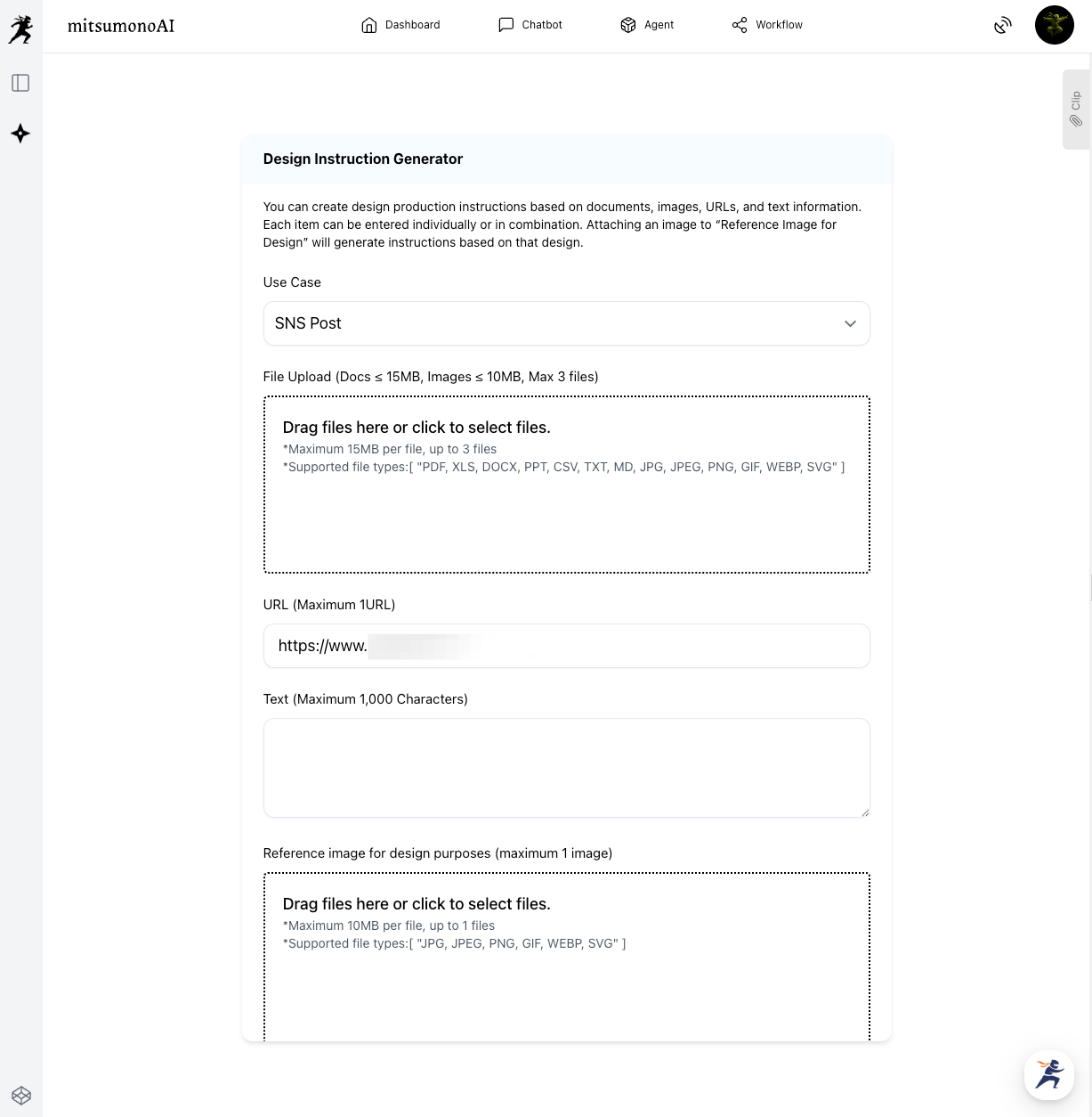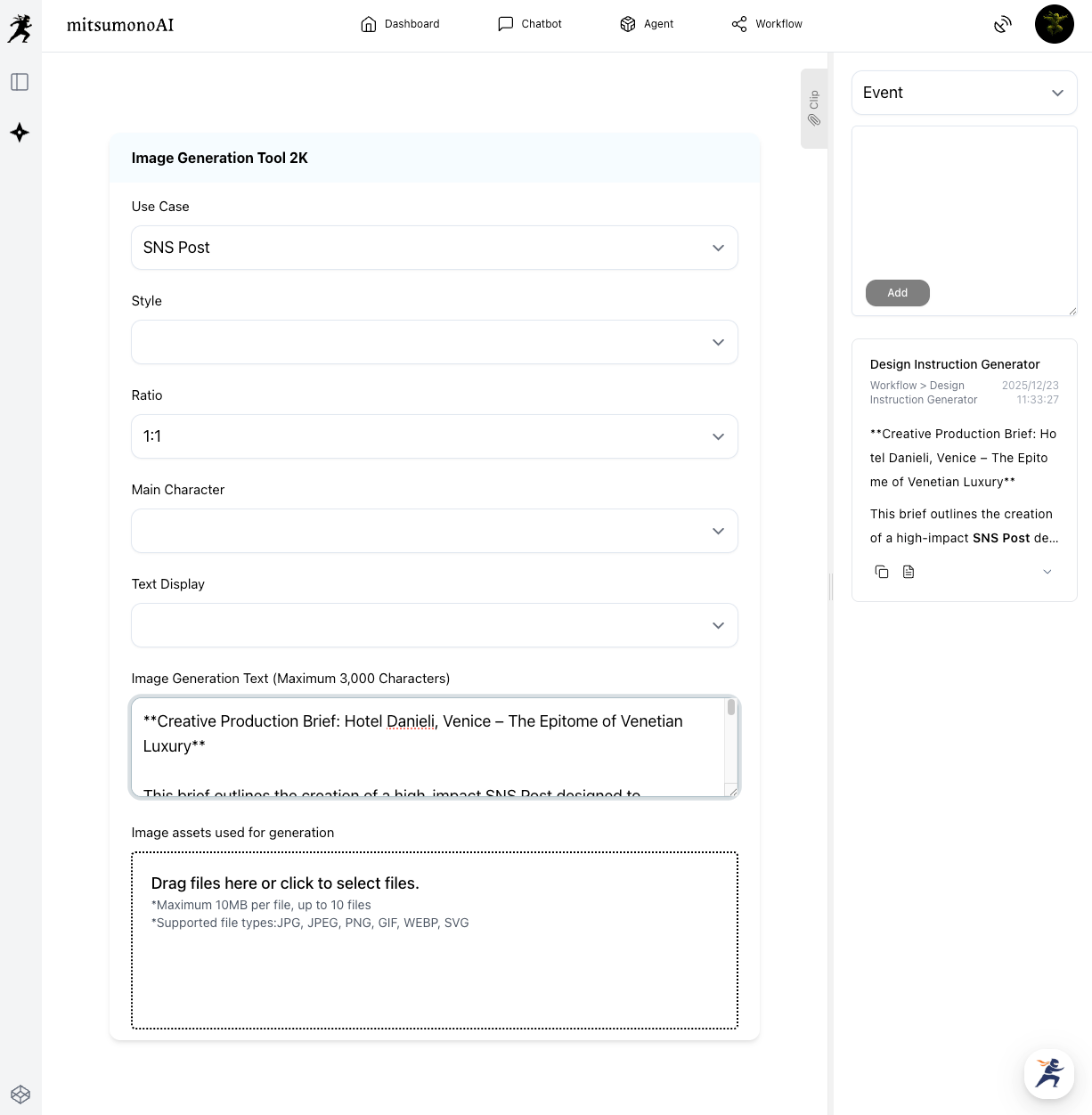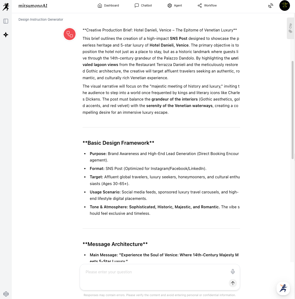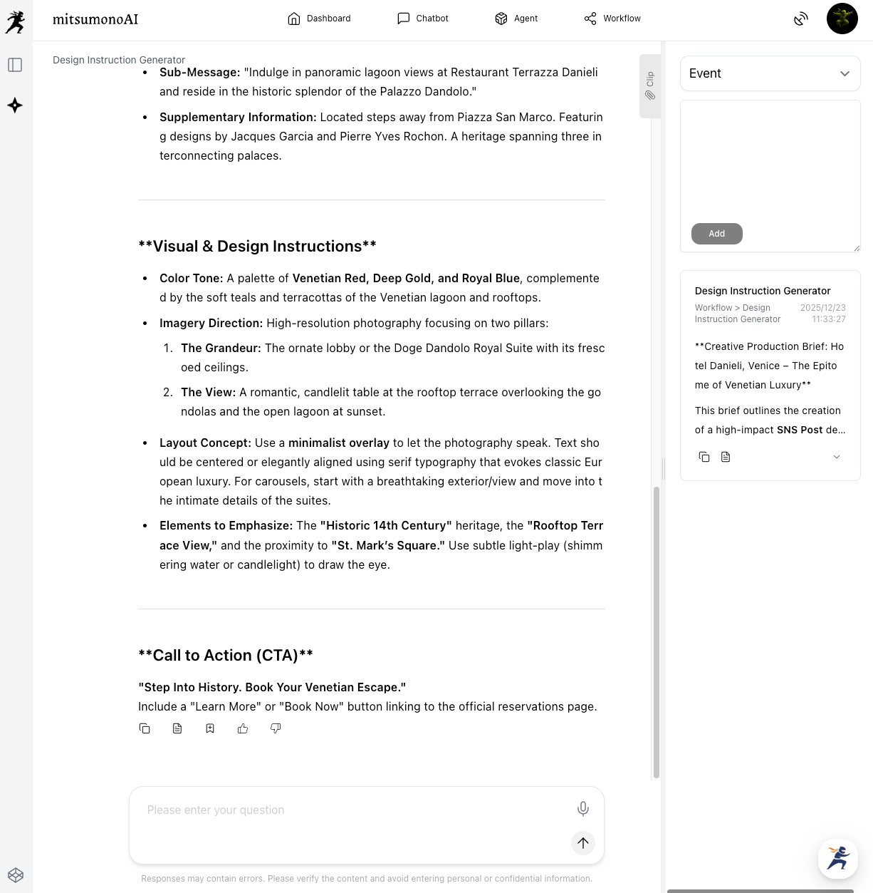 First, we use the Design Instruction Generator to act as our creative director. It will analyze your hotel's website to determine the best visual style for an SNS post.