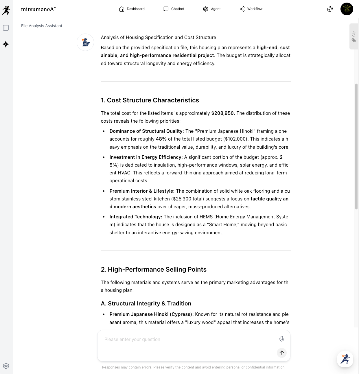 "Analyze the uploaded specification CSV file and list the cost structure characteristics of this housing plan along with high-performance building materials that could serve as selling points."