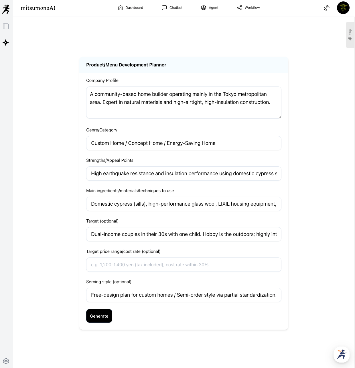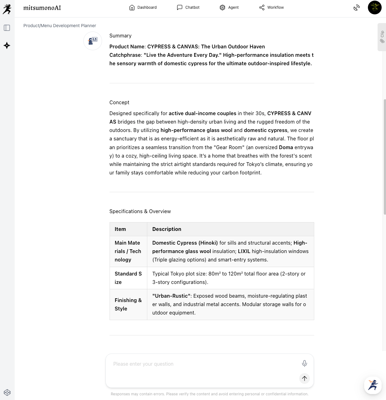 This pilot program generates concepts for new housing plans based on design data. Using specifications (CSV files) exported from CAD, you proceed with development through dialogue with the AI.