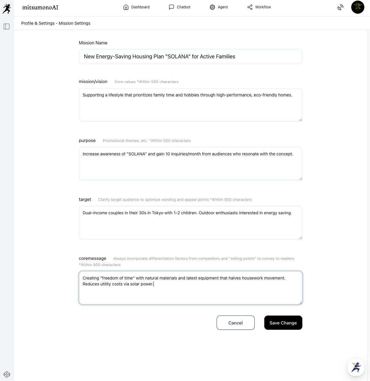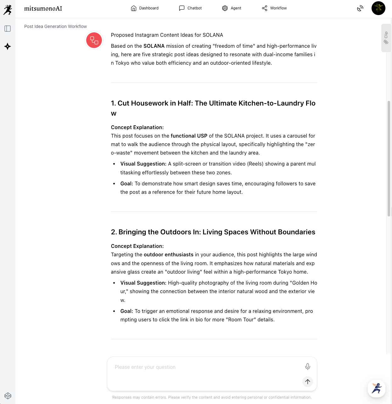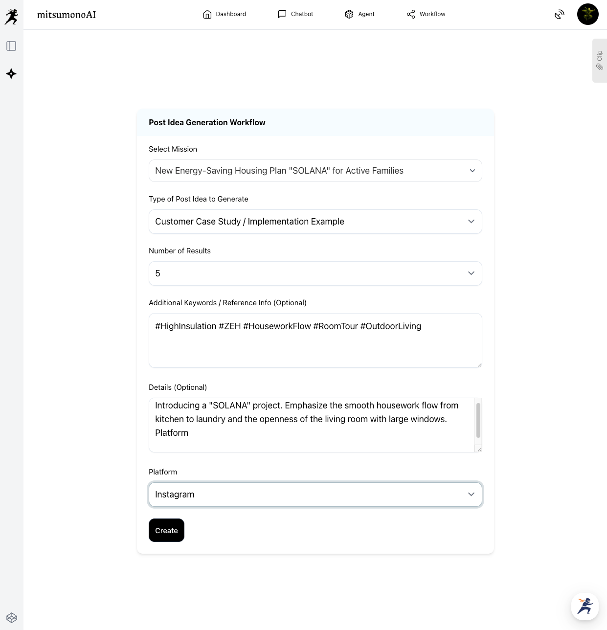 By selecting the registered Mission, the workflow automatically generates consistent post drafts.