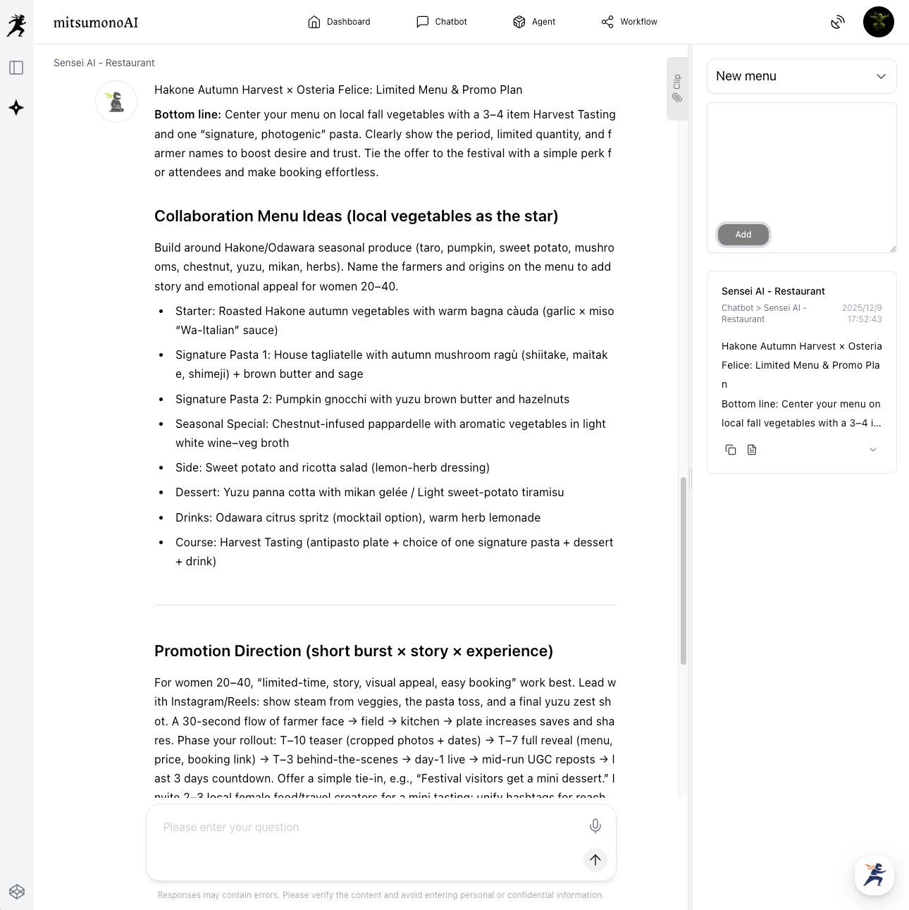 Based on the input information, Sensei AI will suggest menu ideas highly compatible with the event and provide promotional hints that resonate with the target audience. Save this advice from the AI in a "Clip" for use in the next step.
