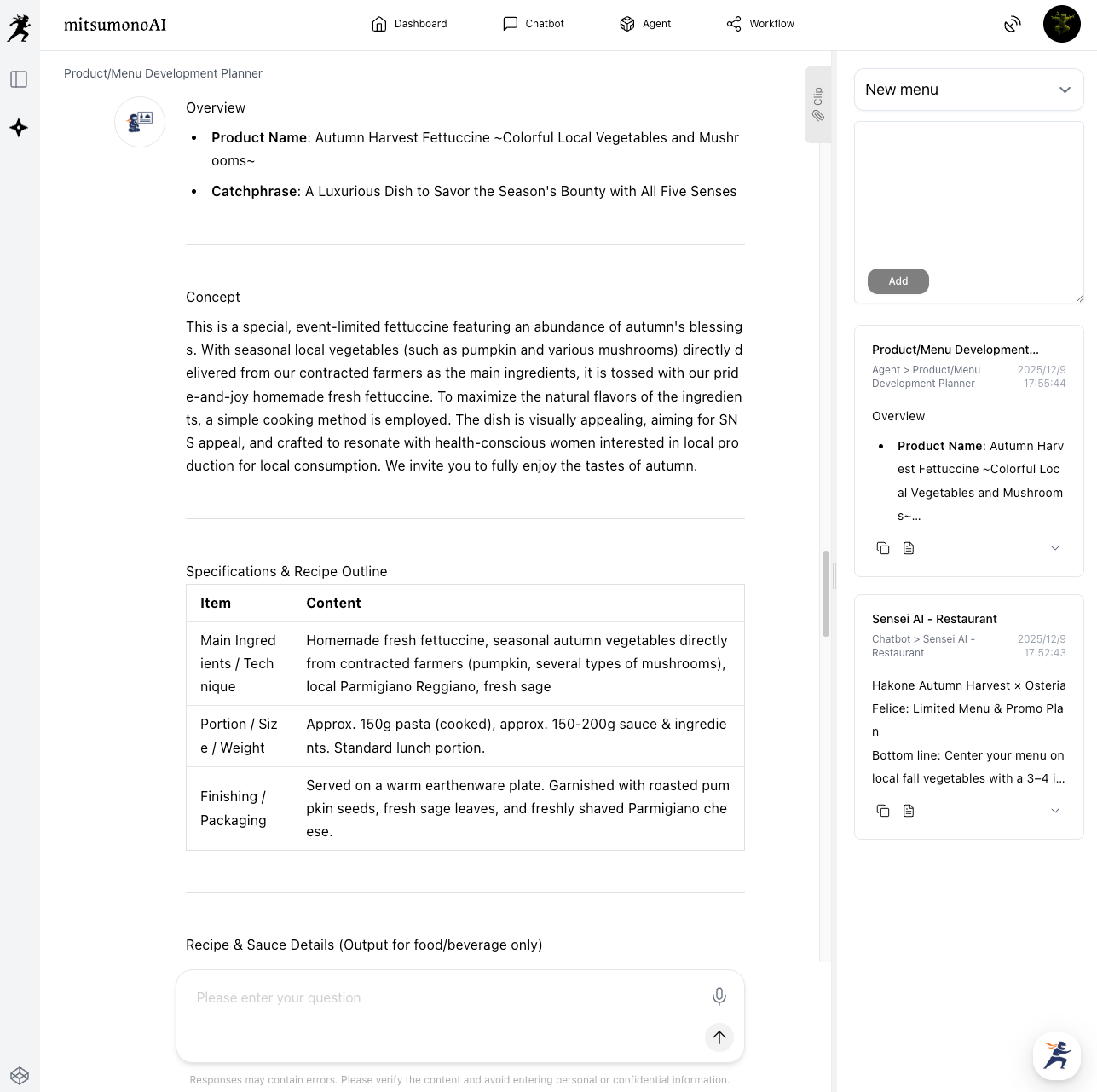 Based on the information you input, the AI will propose concepts for the limited-time menu, specific recipe ideas, selling points, and appropriate pricing.