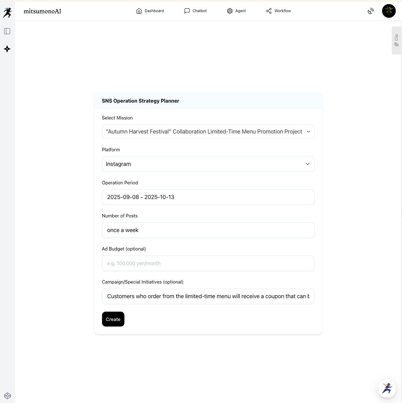To maximize the appeal of the menu finalized in Step 2, first register the foundational information for promotional activities as a "Mission," and then use the "SNS Operation Strategy Planner" to formulate an effective PR strategy.