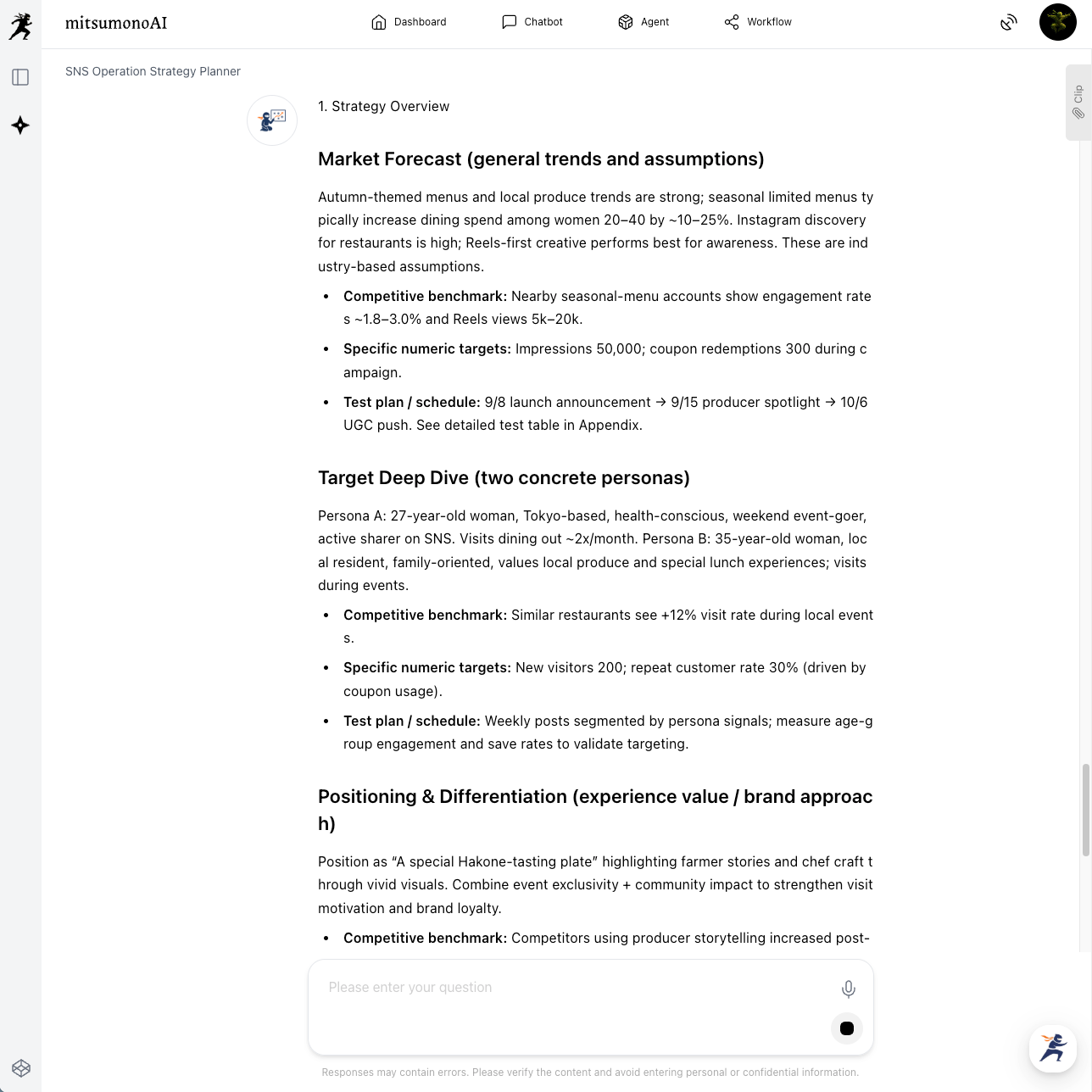 Clicking "Create" will output an analysis of what content to post, when, and how, to reach the target audience most effectively.