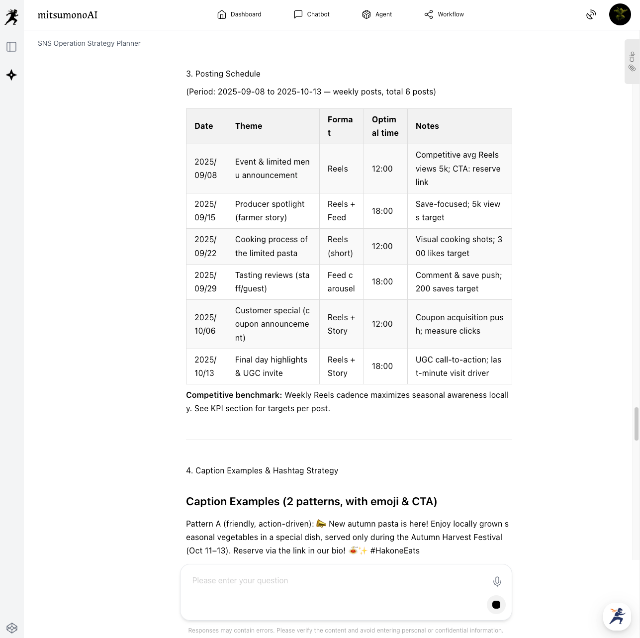 The AI provides ideas from multiple perspectives, allowing you to consistently plan fresh and appealing limited-time menus. - Optimized SNS Operation
