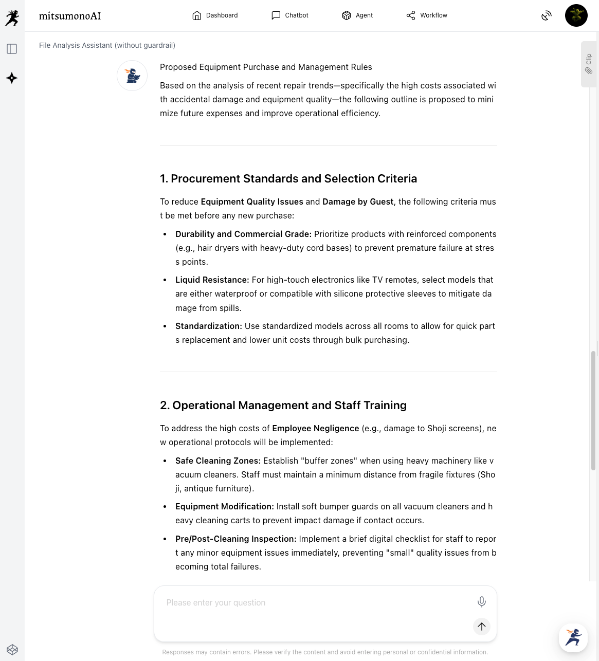 mitsumonoAI’s "File Analysis Assistant" derives specific cost-reduction measures from repair data that was previously overlooked. For the hospitality industry, for example, the following types of analysis are possible: