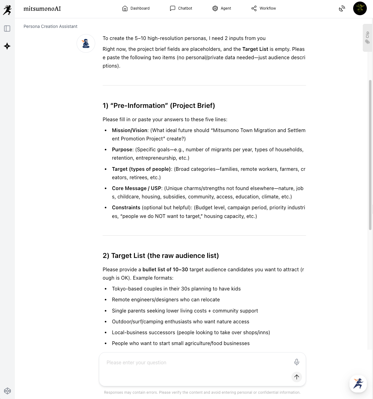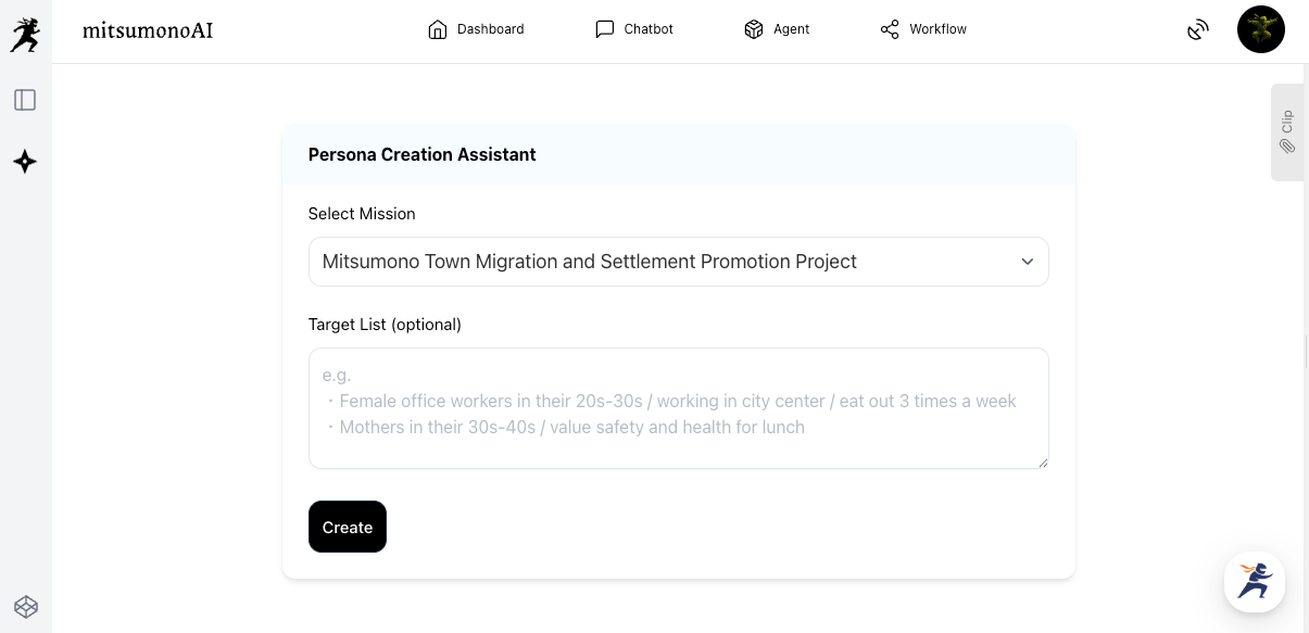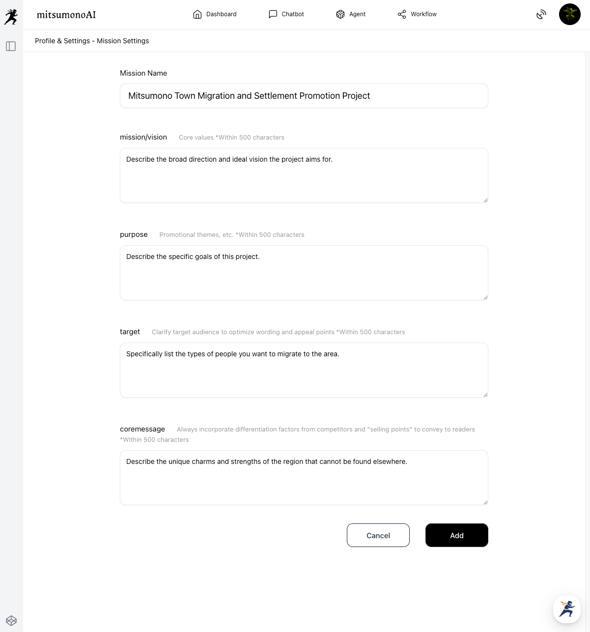 The first step is to clearly verbalize the purpose and target of the migration promotion project managed by your local government and register it as a "Mission" in the AI. This serves as the most important foundation for increasing the accuracy of all subsequent processes.