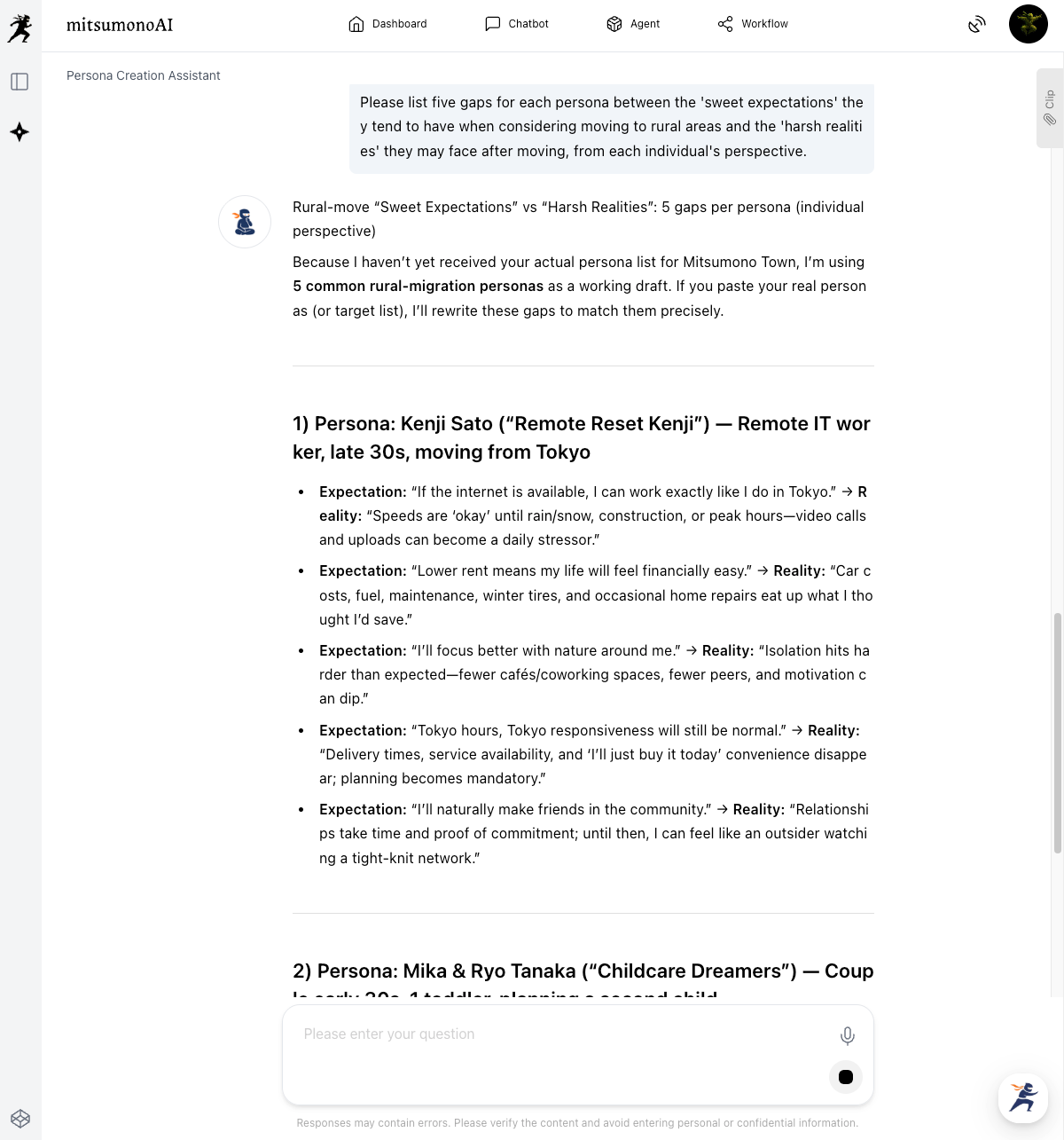 This is the core of the method. Treat the personas created in STEP 2 as "virtual consultee" and have the AI predict the gaps between the ideals they tend to hold and the actual reality. The key is to use this as a "draft for dialogue" so that the prospective migrant and the official can face the same direction and overcome challenges together.