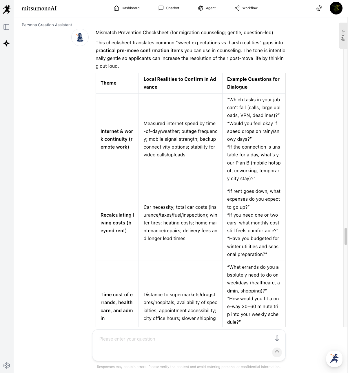 "Based on the information provided, please create a 'Mismatch Prevention Checksheet' that can be used in actual migration counseling. Use a gentle, questioning format to increase the resolution of post-migration life, and summarize it in a table including the following items: