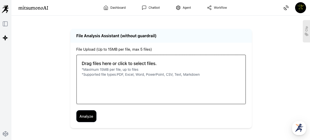 Upload your event documents (PDF, Word, Excel, etc.) to the File Analysis Assistant (please choose the appropriate version based on your need for guardrail masking/blocking).