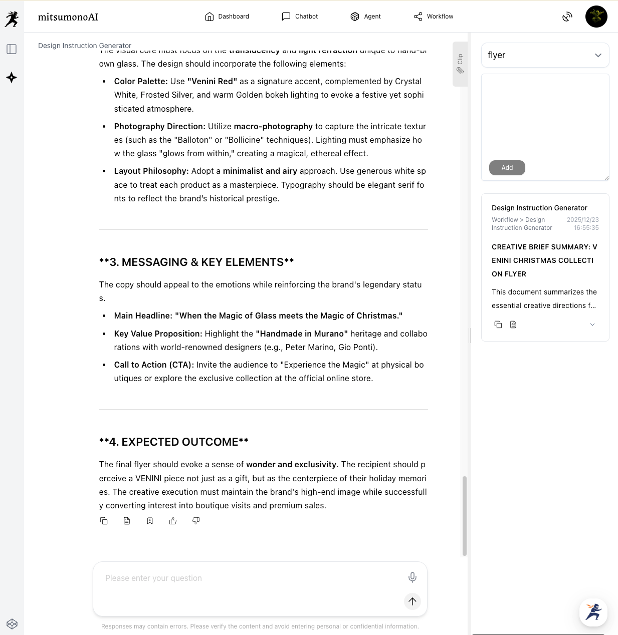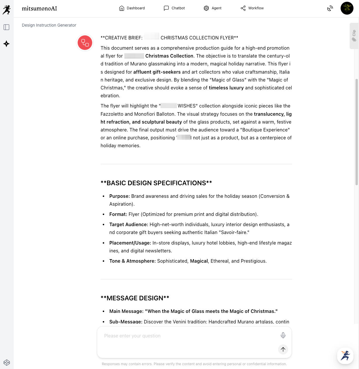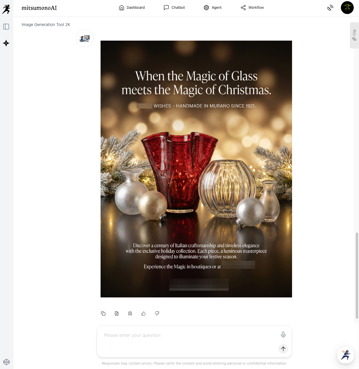 - Attach Reference Image: To ensure the AI understands "luxury," upload a professional photo of a Murano glass masterpiece or a high-end holiday advertisement into the "Reference image for design purposes" box.