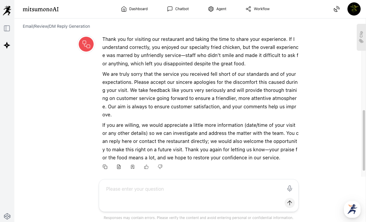 We introduce how to use the "Email/Review/DM Reply Creation Workflow" and how to efficiently draft replies that include the necessary elements for responding to especially low-rated reviews.