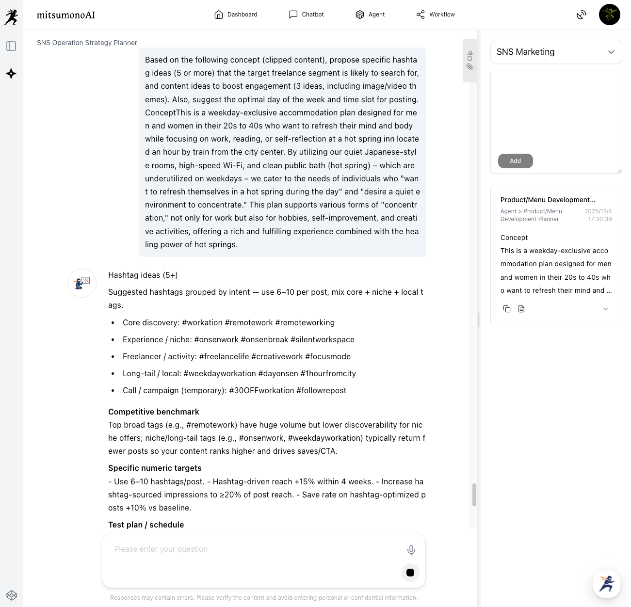 The AI proposes effective hashtags, posting times, and content themes that resonate with the target segment, maximizing the effectiveness of SNS promotion. - Increased Operational Efficiency and New Idea Generation