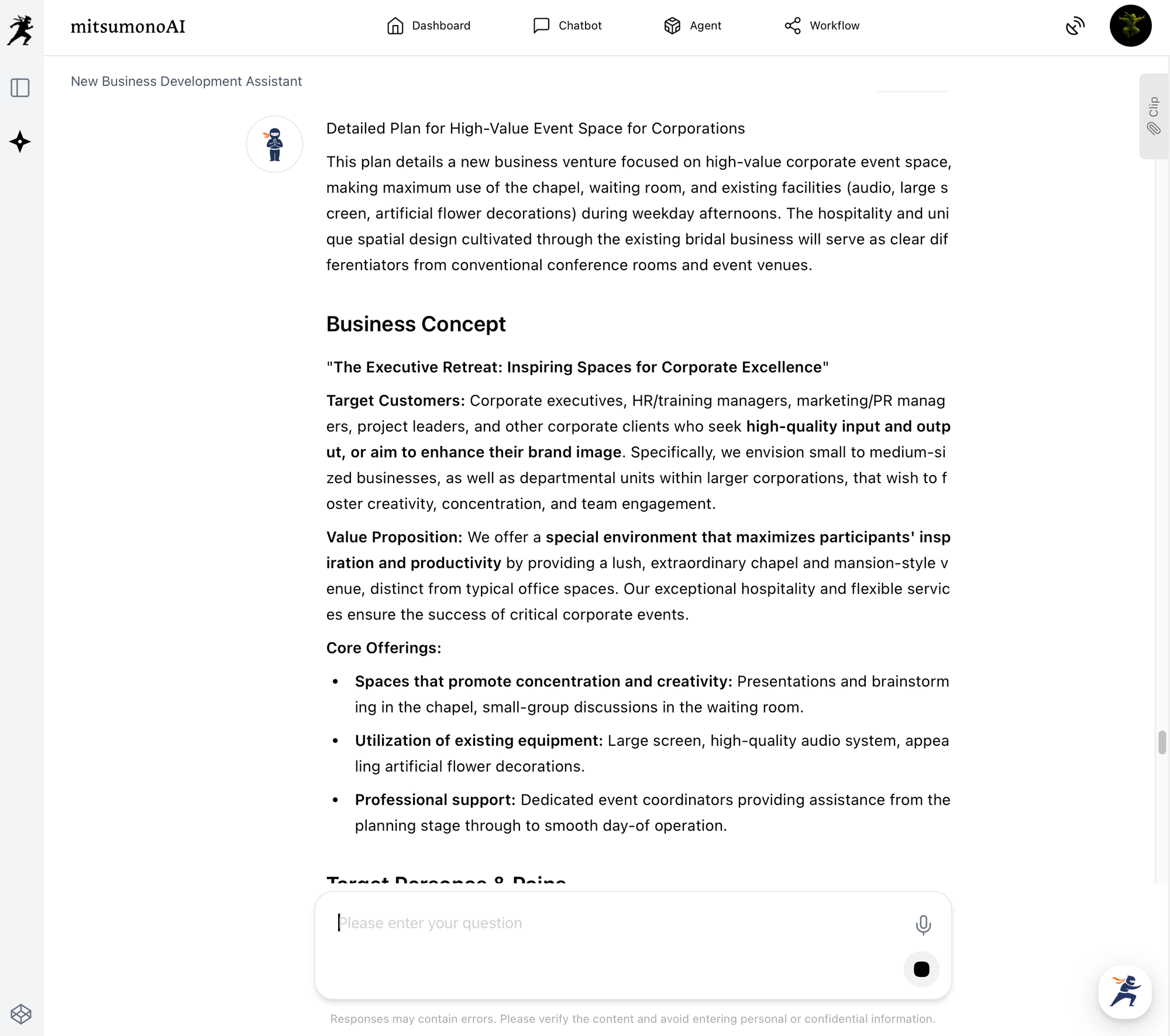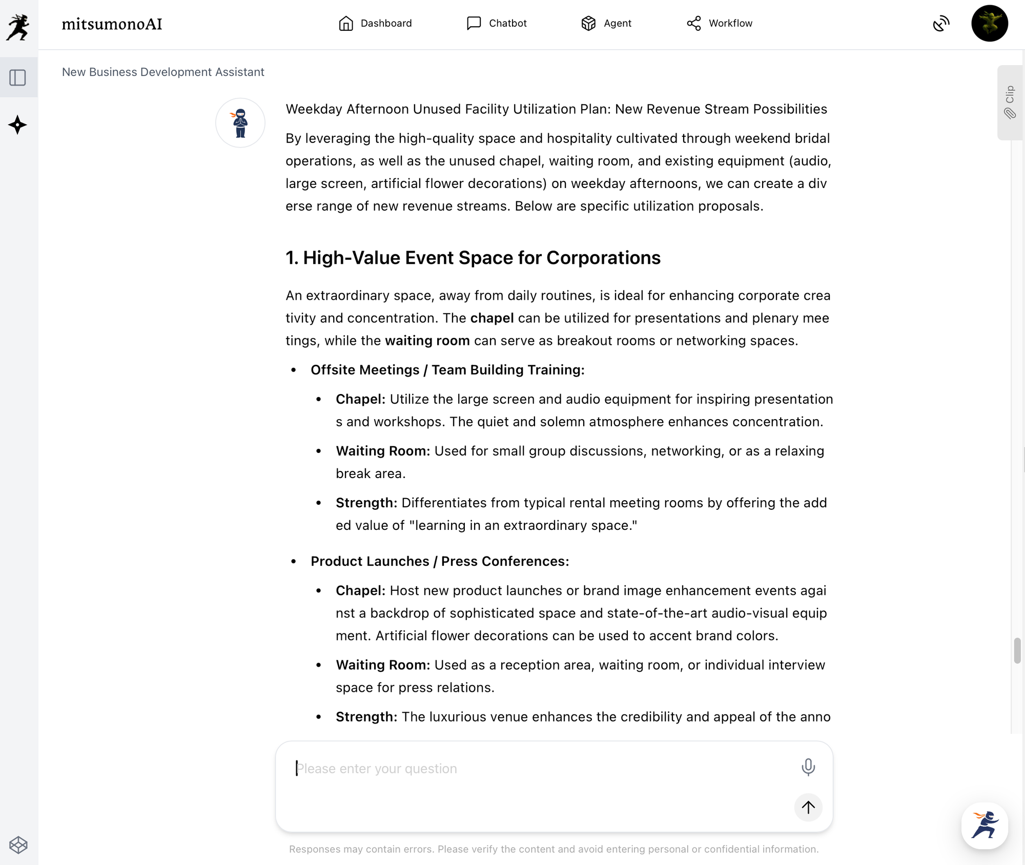 The initial output provided suggestions such as "High-Value Event Space for Corporations," "Retreat & Experiential Programs for Local Community & Individuals," and "Creative & Art-Oriented Utilization."