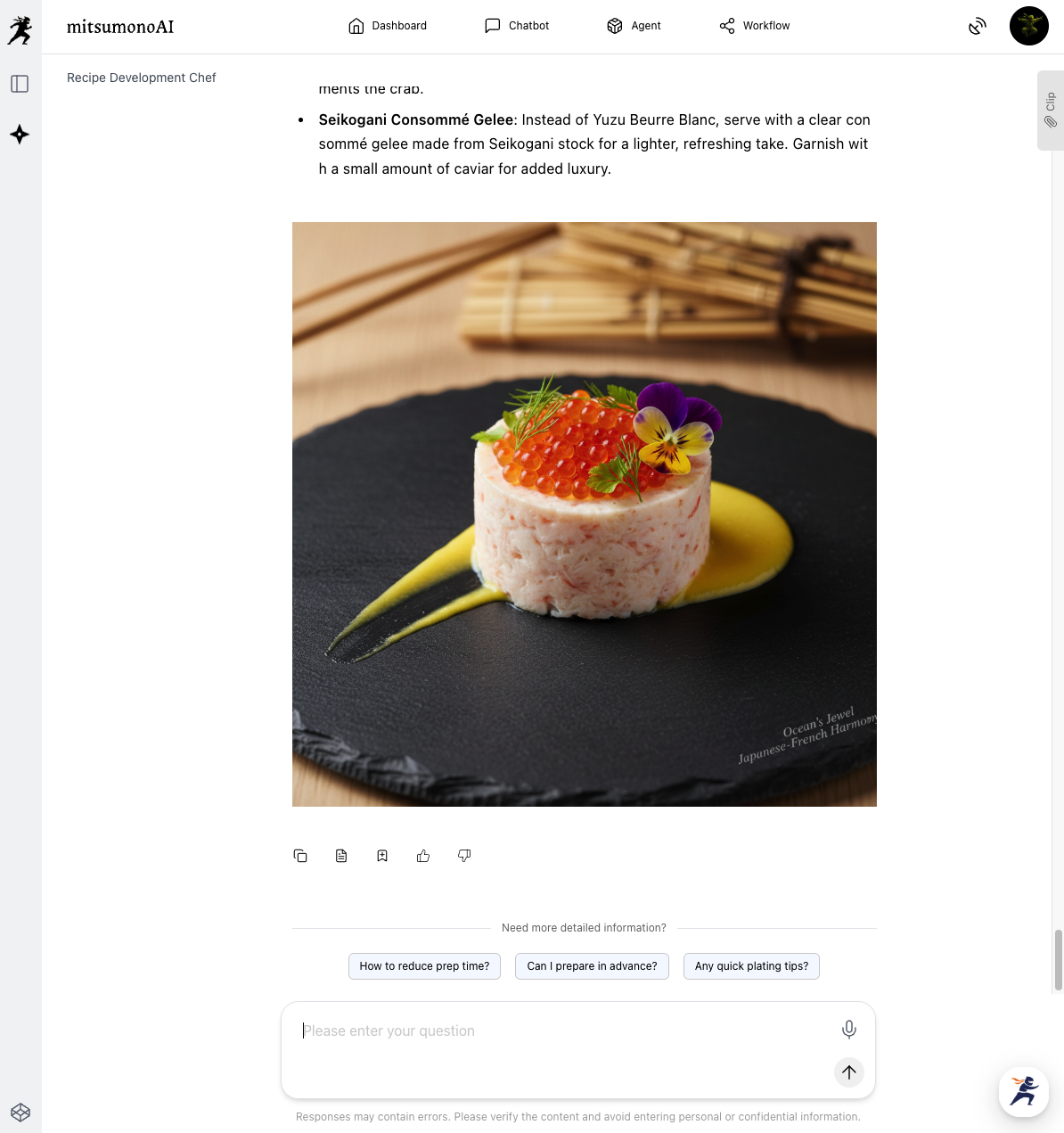 By providing simple additional instructions, such as "Adjust the recipe to be easier to prepare," the "Recipe Development Chef" instantly regenerates a new recipe with simplified techniques and steps, while preserving the quality of the concept.
