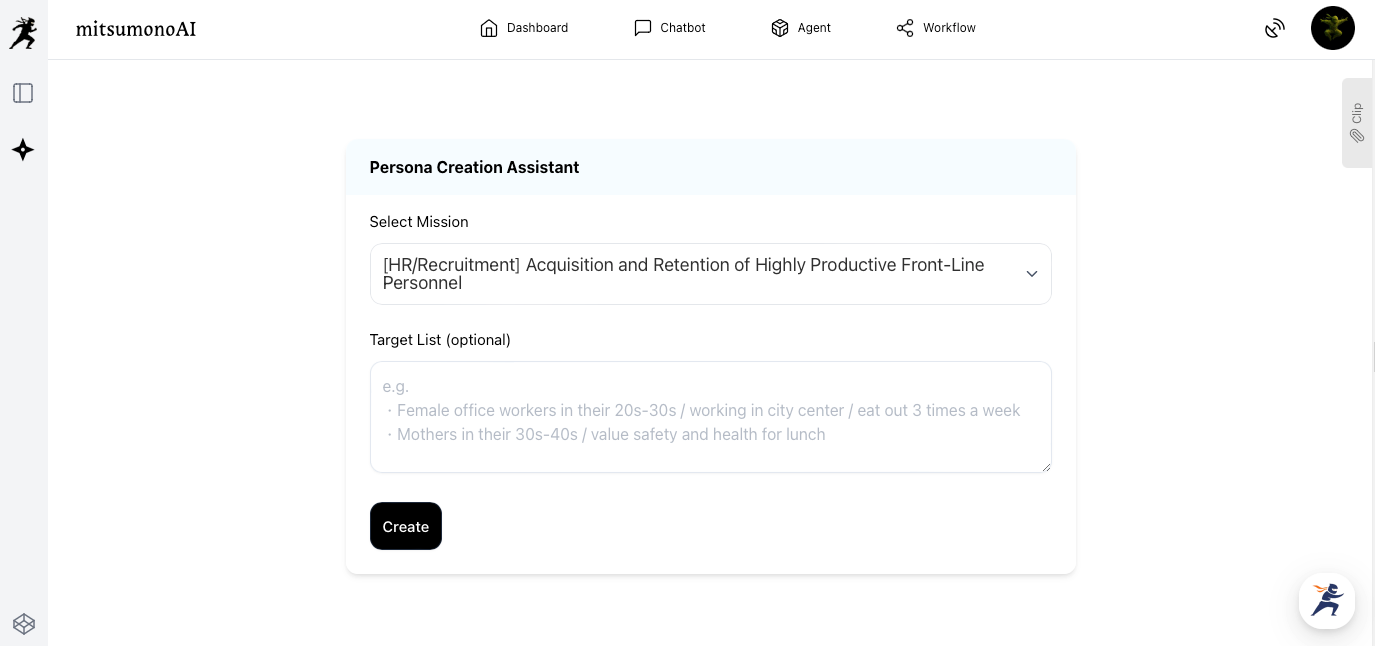 To create an ideal front-line staff persona using the "Persona Creation Assistant," select the mission registered in Step 1 and click "Create."