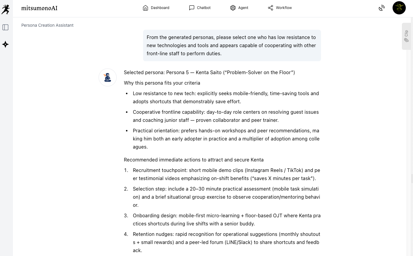 Once the persona list is generated, select the one persona considered most ideal for a front-line staff member. Alternatively, you can instruct the AI to make the selection.