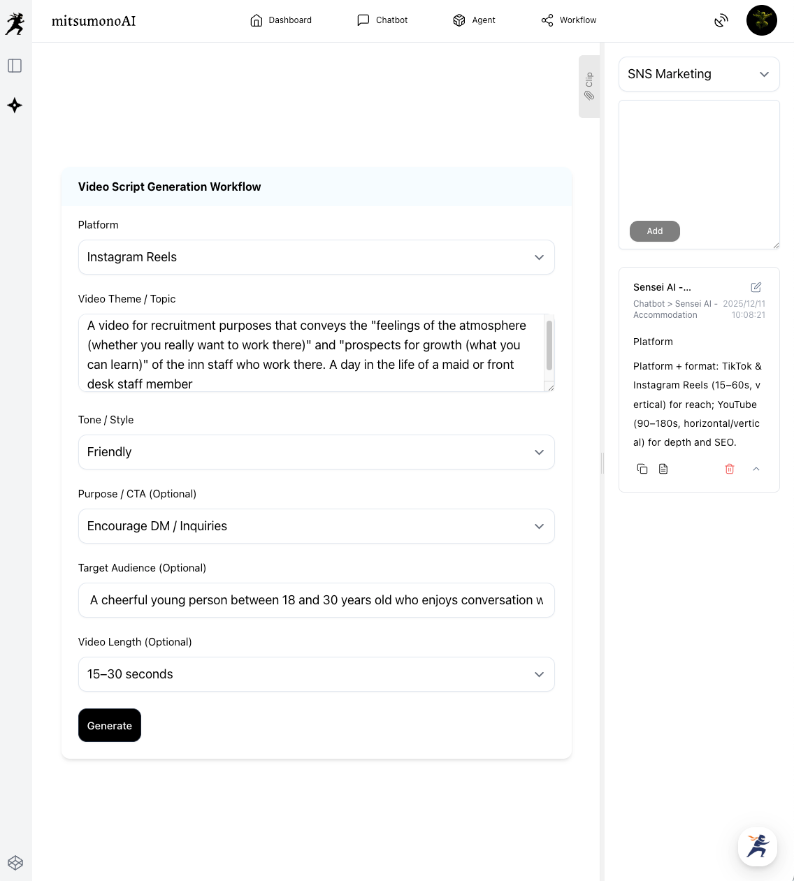 Based on the advice obtained from Sensei AI in Step 1 (refer to the clips), input the information into the Video Script Creation Workflow and click "Generate."