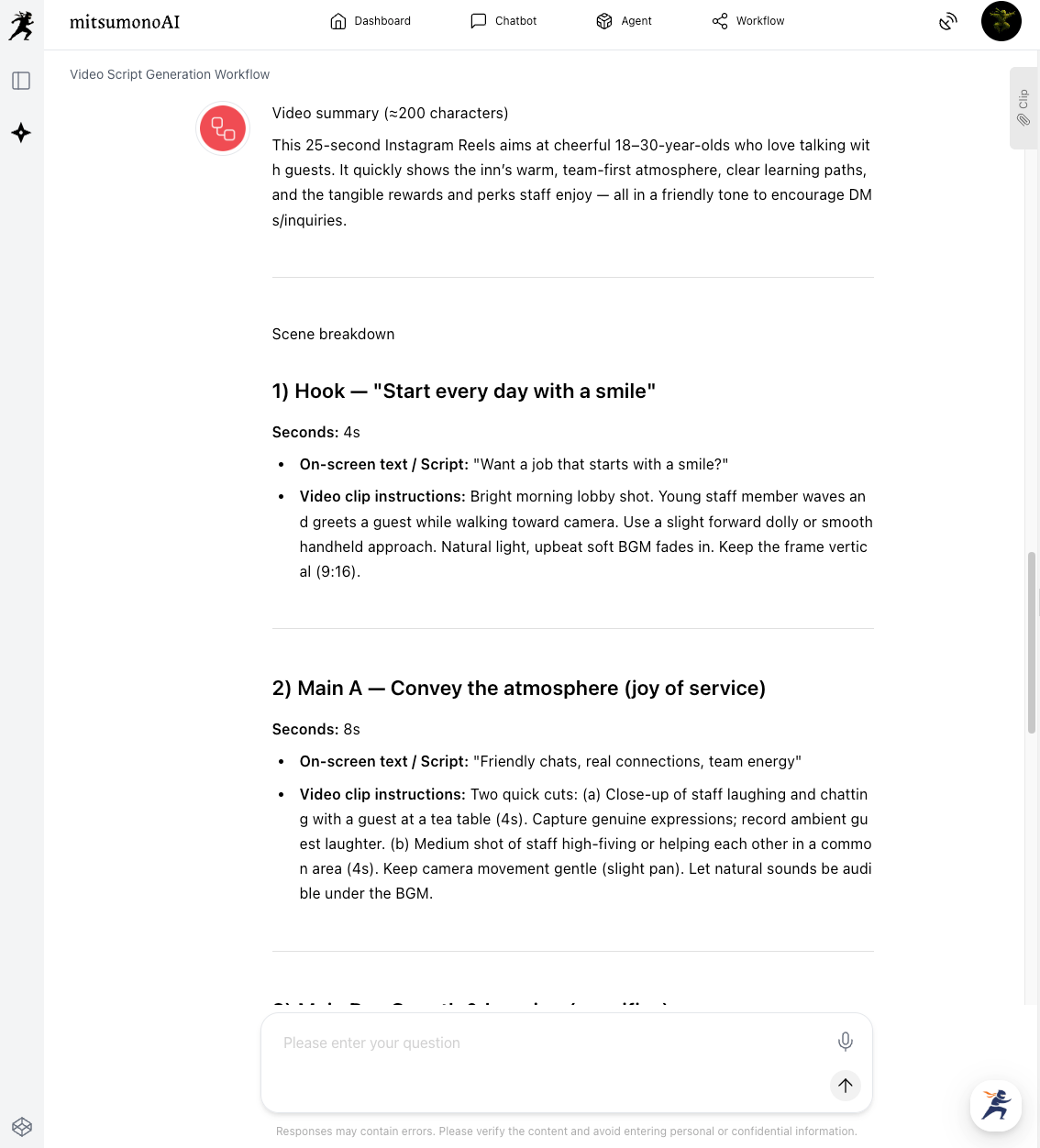 Next, we will obtain specific information that can be directly used for each item in the "Video Script Creation Workflow" using the following questions.