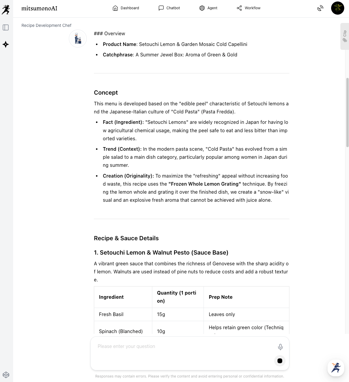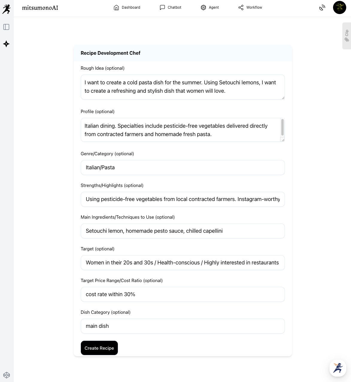Launch the Recipe Development Chef and enter your restaurant profile, target audience, and the ingredients you want to use.