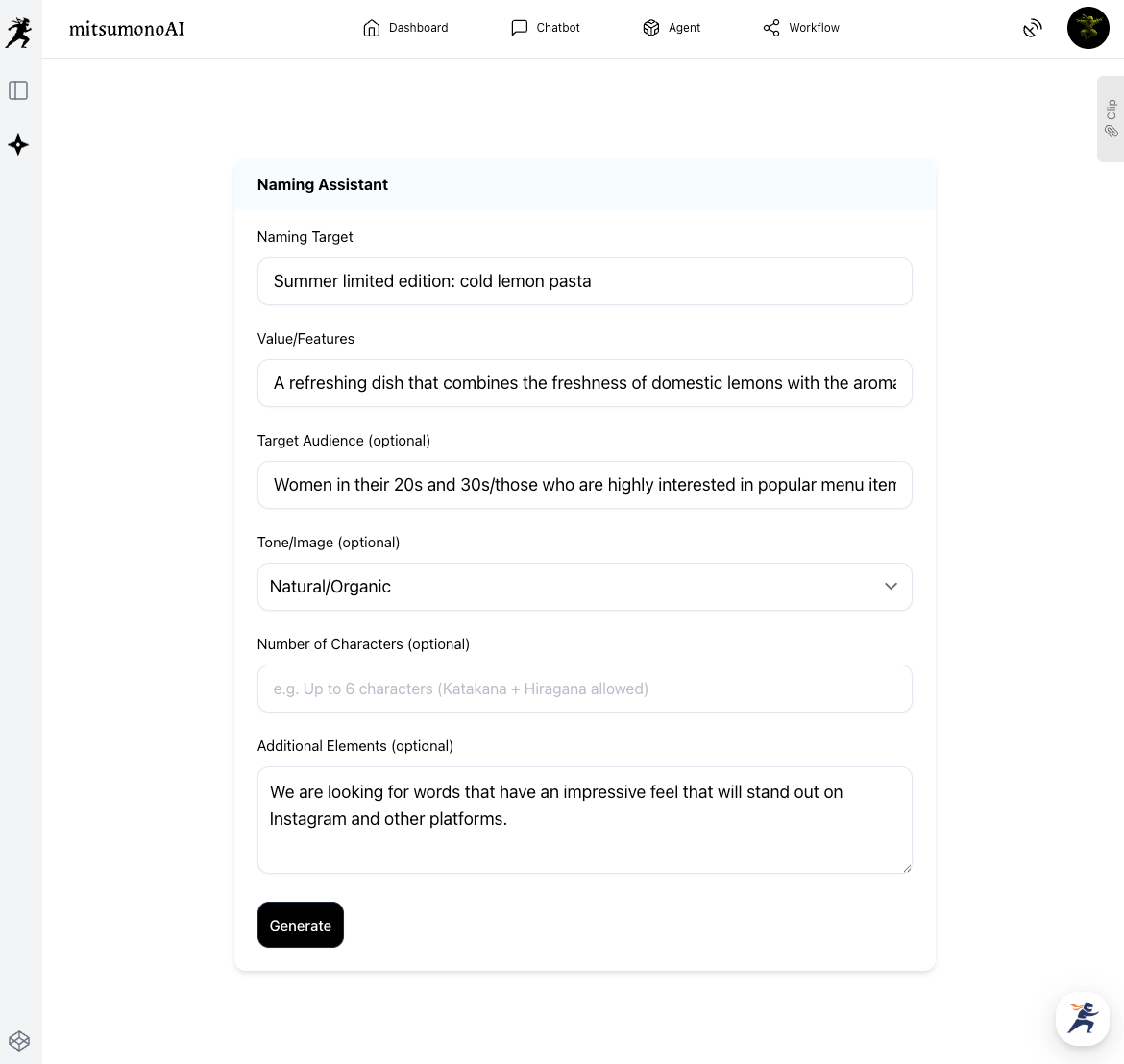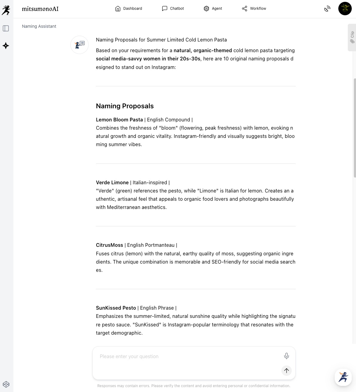 Proposes creative and feasible recipes integrated with a solid concept based on your restaurant’s identity and seasonal ingredients. - Naming Assistant: