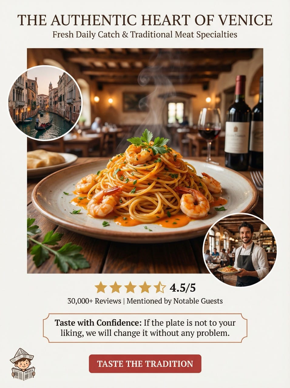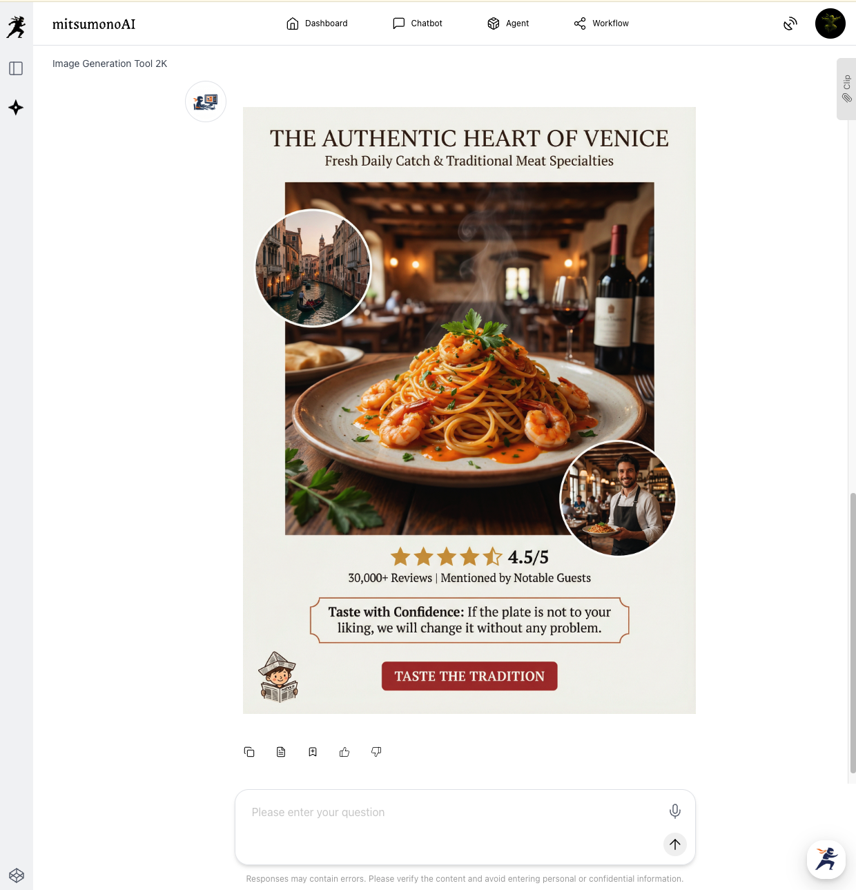 - Generate: The AI analyzes the sophisticated Venetian atmosphere and the gourmet details of the dishes.