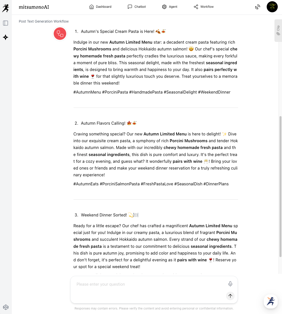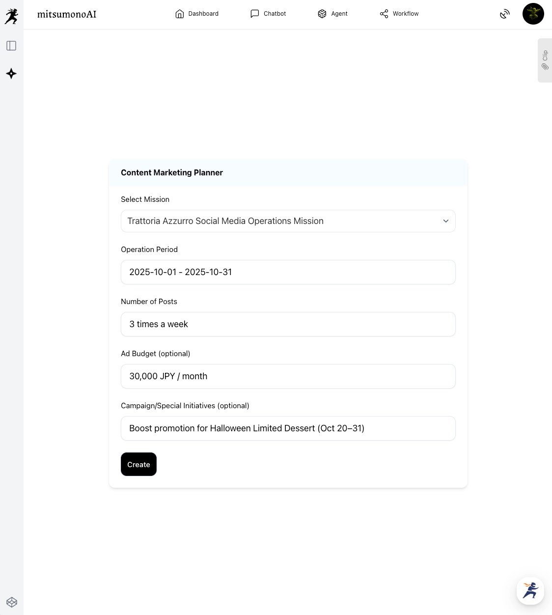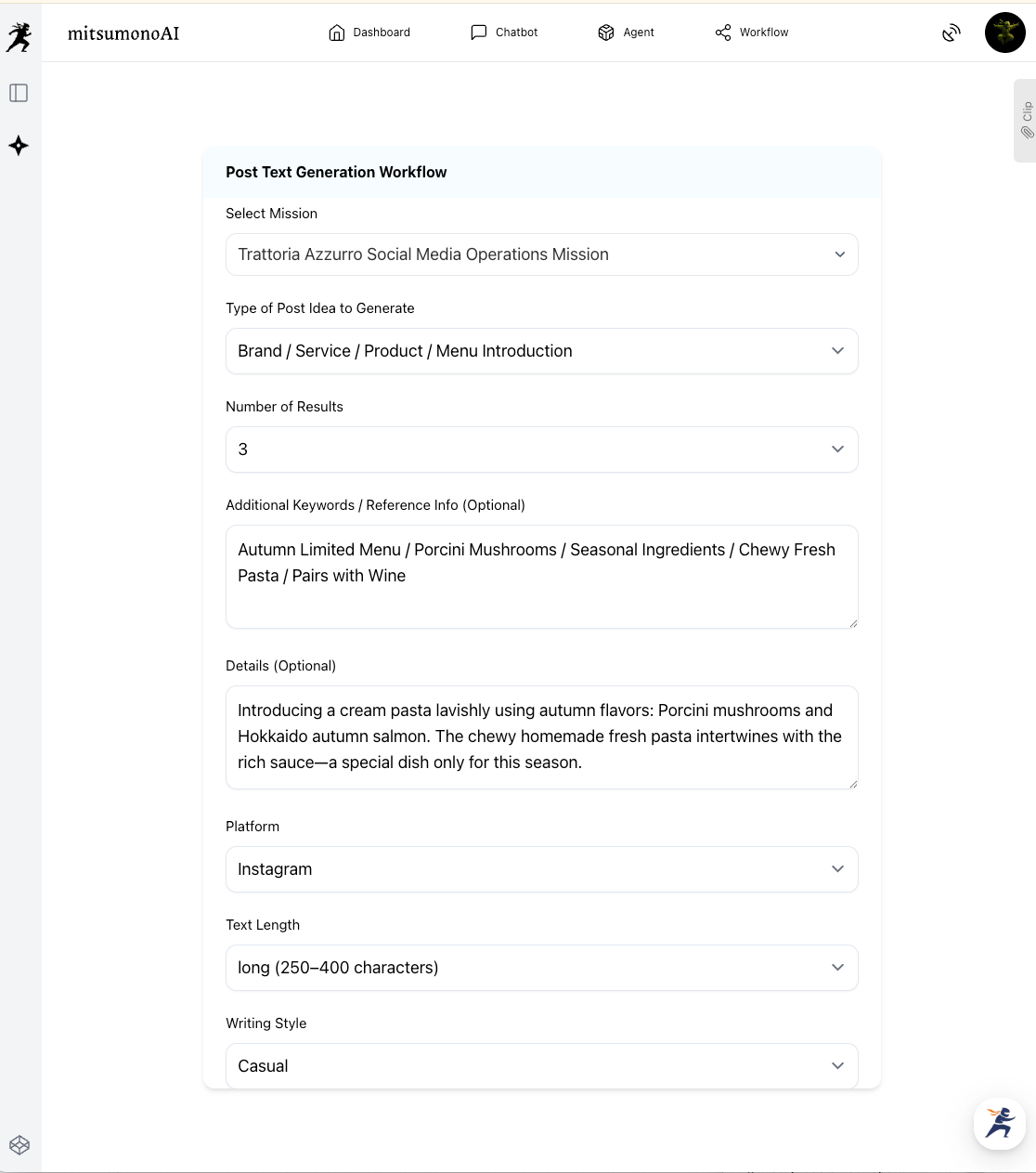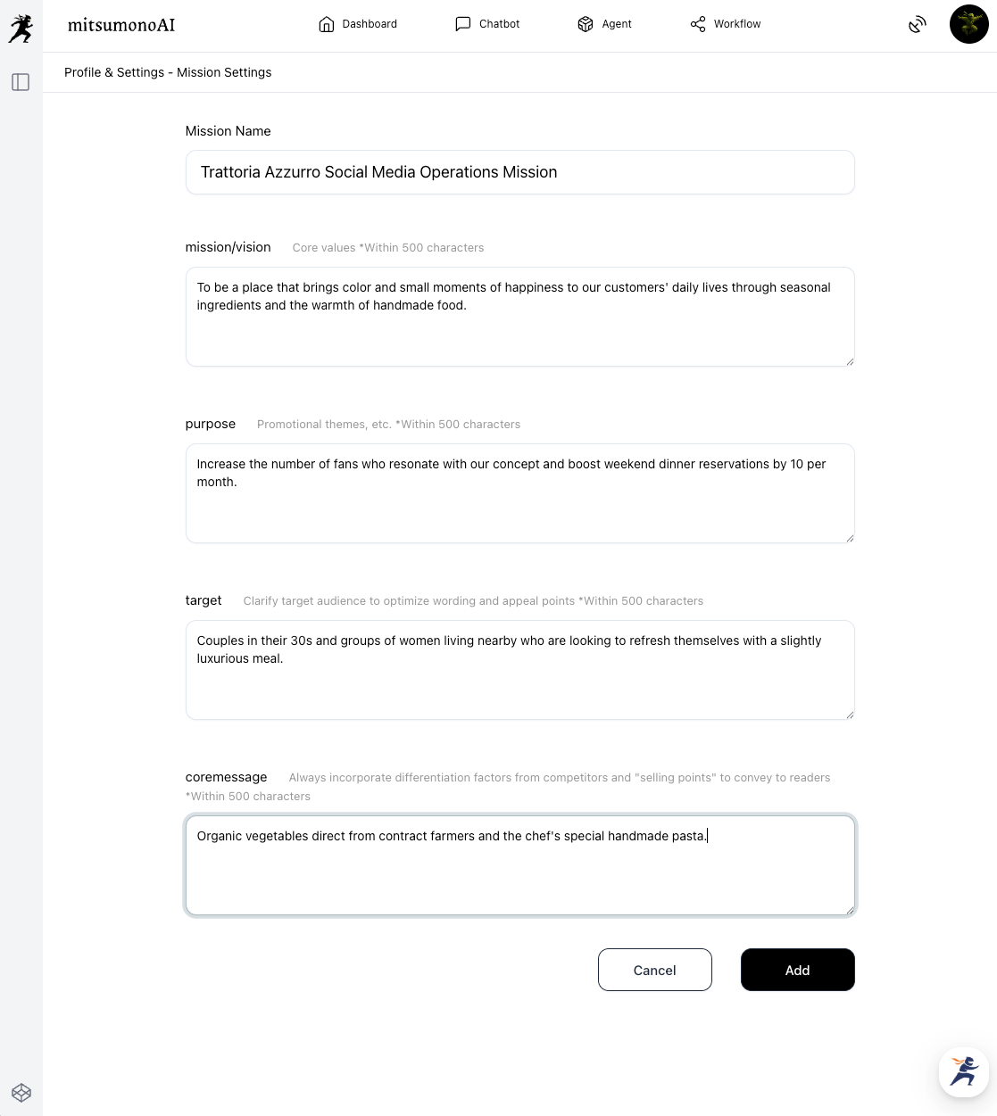 The most critical first step in automating SNS management is this "Mission Registration." By teaching the AI the "unwavering core"—such as your restaurant's concept and target customers—here, all future AI-generated content will be consistent and aligned with the soul of your restaurant.