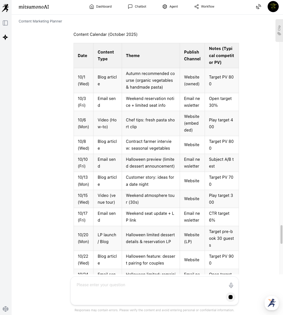 A concrete content calendar is also generated, clearly indicating what to post and when.