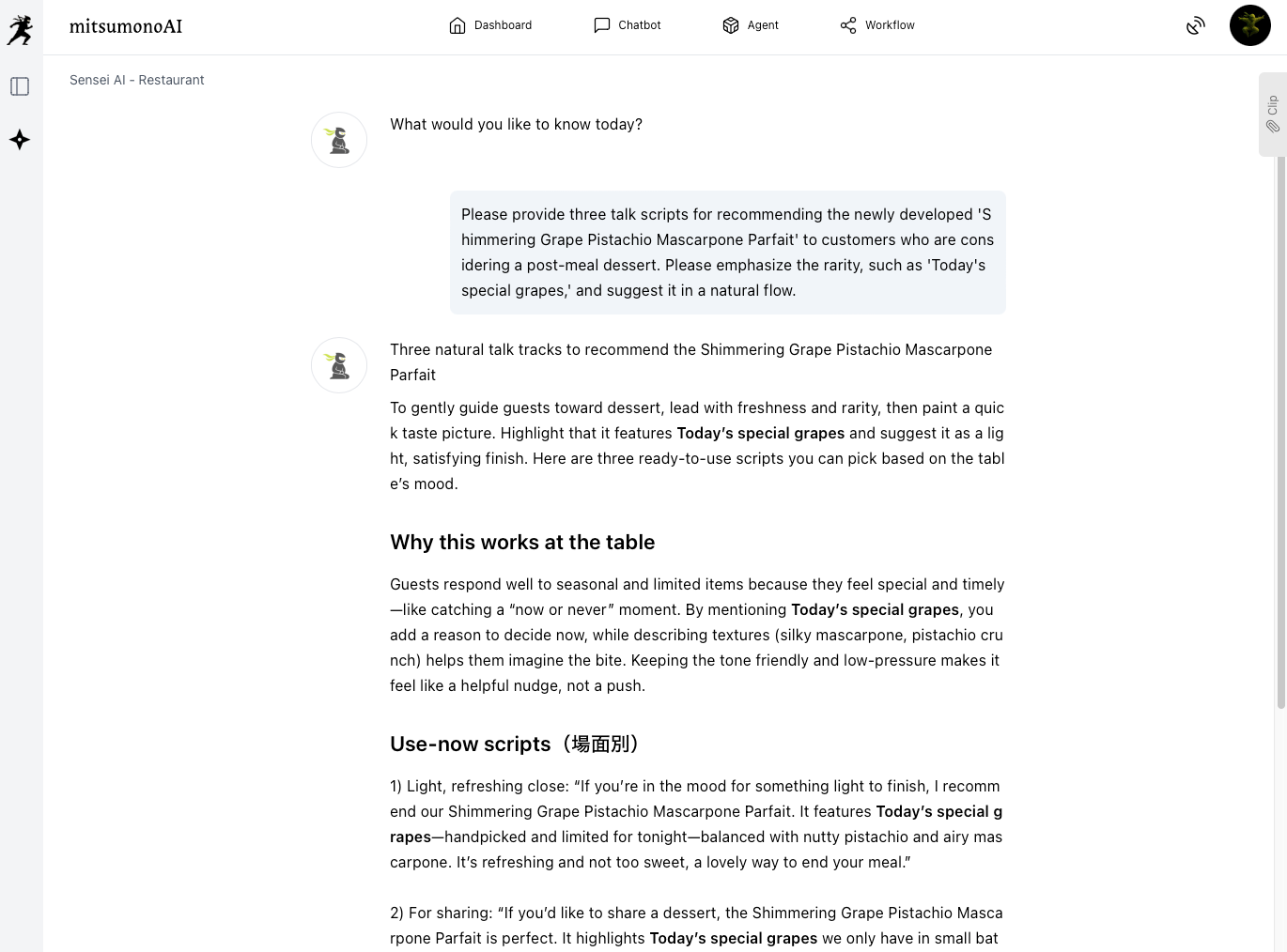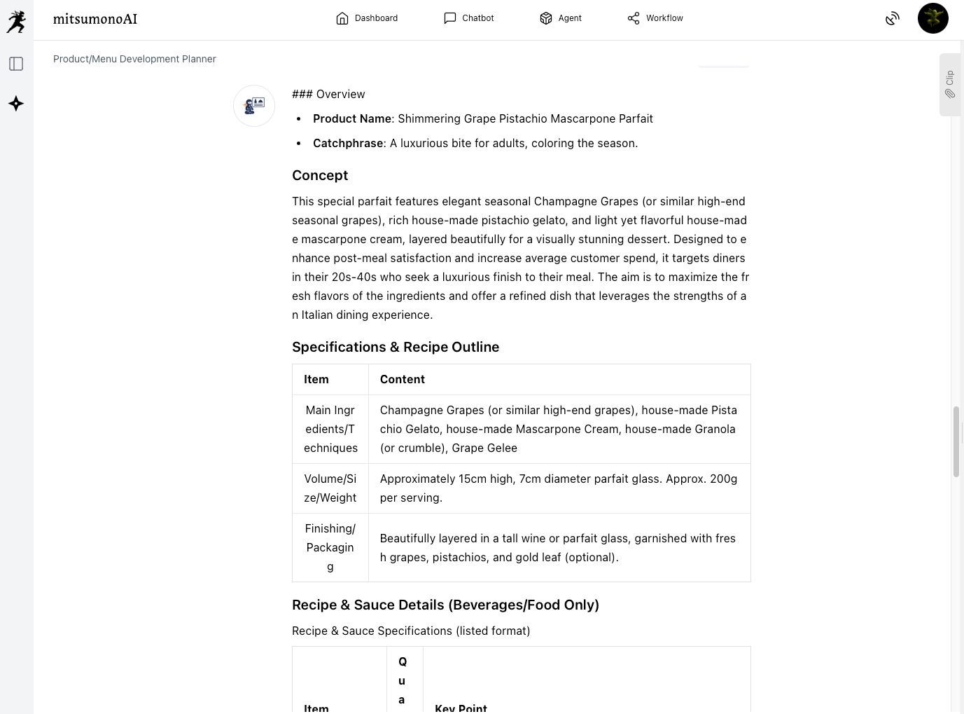 The AI proposed a specific menu: "Shimmering Grape Pistachio Mascarpone Parfait". It is recommended to use this proposal as a base and refine it while considering the actual situation of your restaurant.