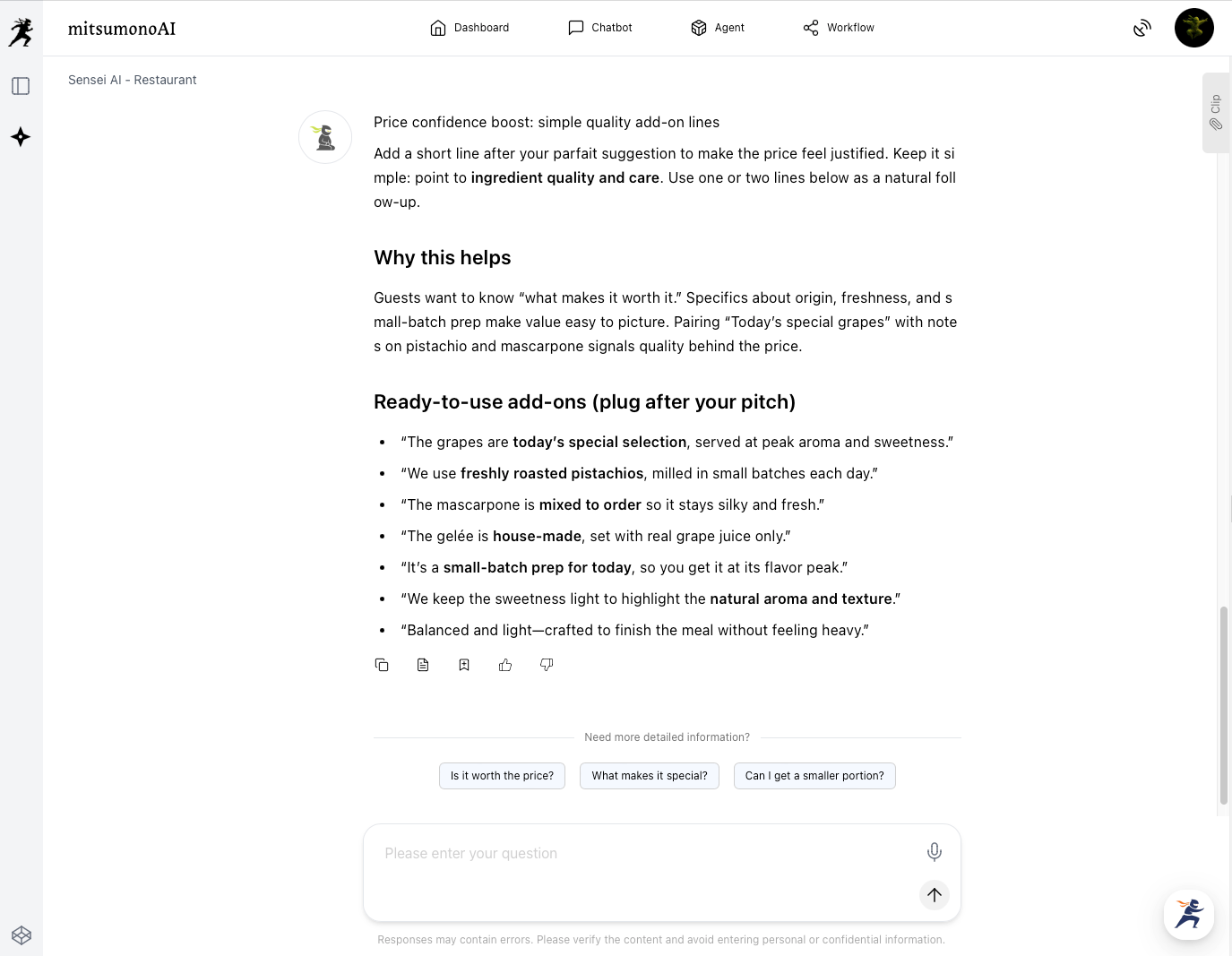 Based on the analysis results (e.g., "Comments scattered that the parfait is delicious but a bit expensive"), please leverage the 'History' feature to consult with Sensei AI again.