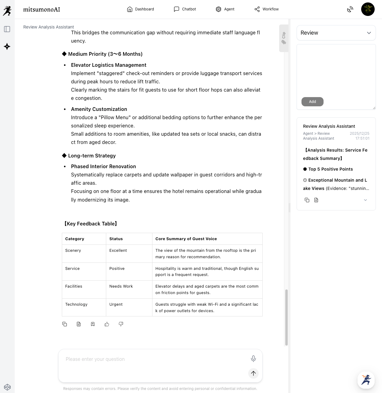 You can efficiently analyze guest feedback based on data rather than intuition, leading to concrete service improvements. By objectively evaluating how guest feedback changes before and after improvements, you can maintain a high-ROI improvement strategy. This promotes higher customer satisfaction, increased repeat rates, and a boost in positive word-of-mouth, significantly contributing to the property's brand image and profitability.