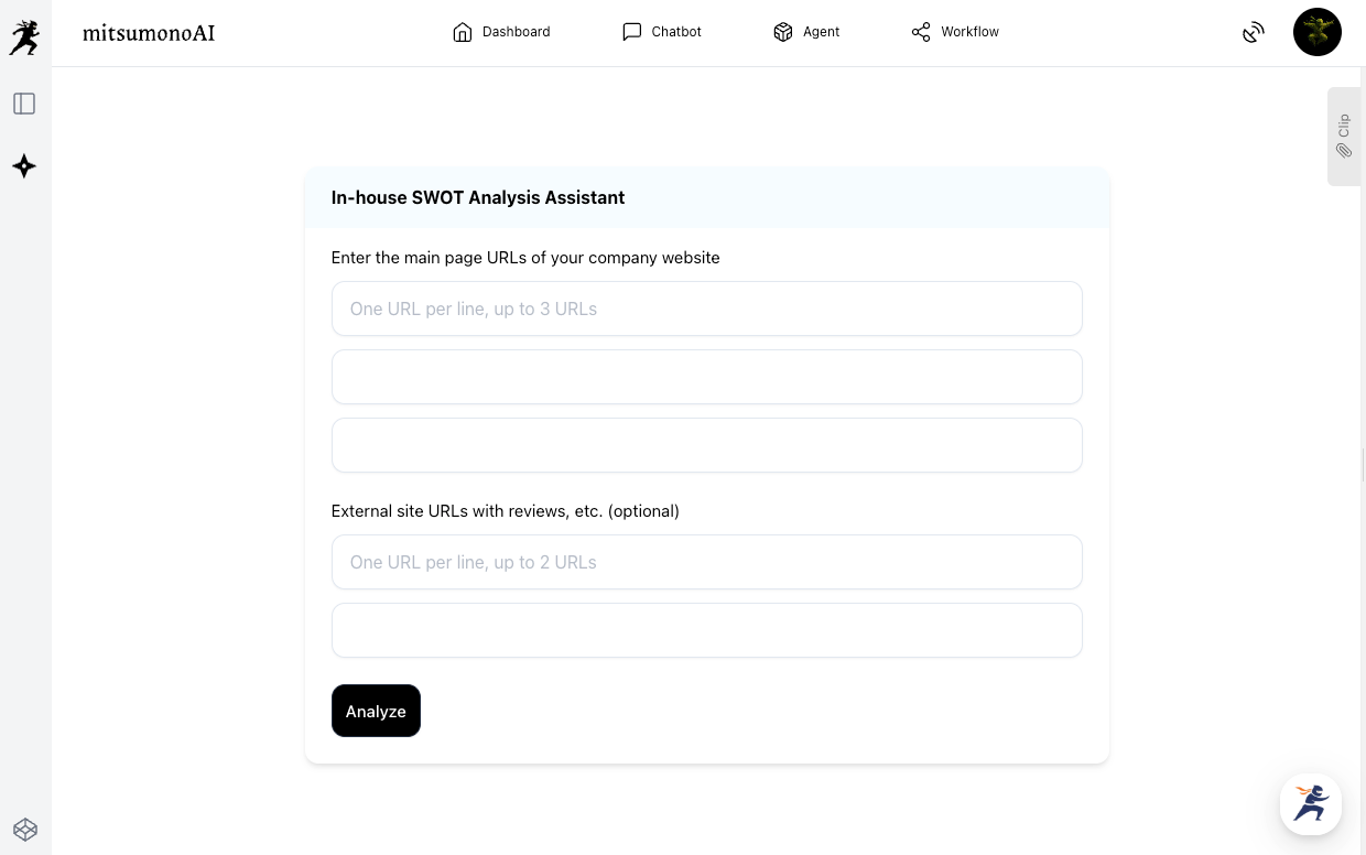 After the analysis, use the "Clip" feature to save the SWOT results—especially the "Strengths" and "Opportunities"—for later use.
