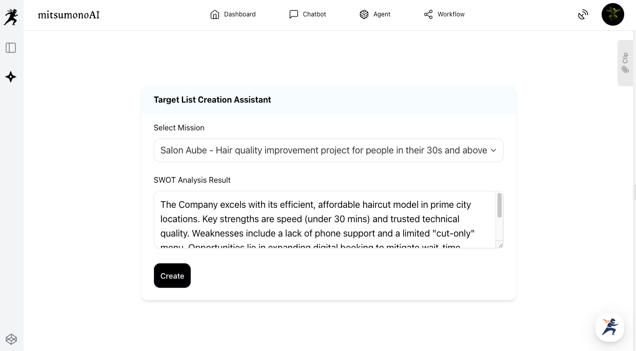 Automatically analyzes and visualizes your "Strengths, Weaknesses, Opportunities, and Threats" using information from your official website and review sites. - Target List Creation Assistant: