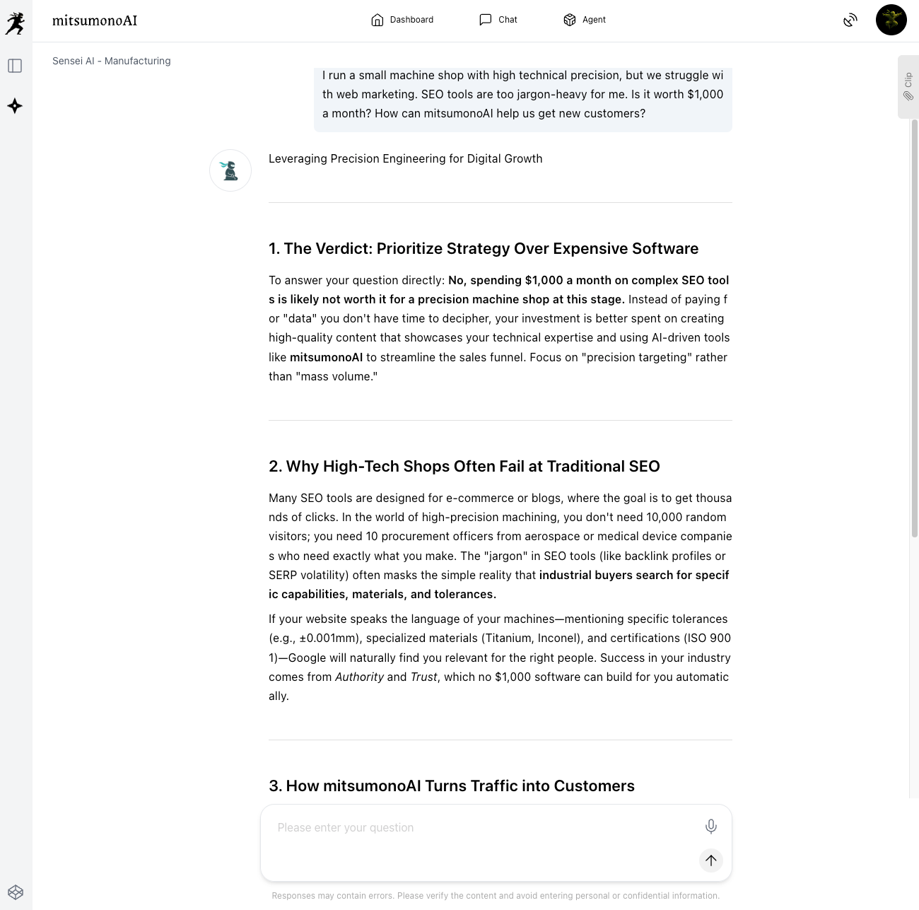 "I run a small machine shop with high technical precision, but we struggle with web marketing. SEO tools are too jargon-heavy for me. Is it worth $1,000 a month? How can mitsumonoAI help us get new customers?"