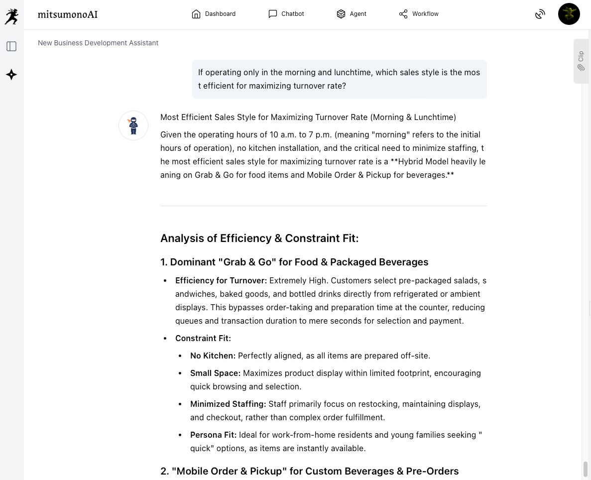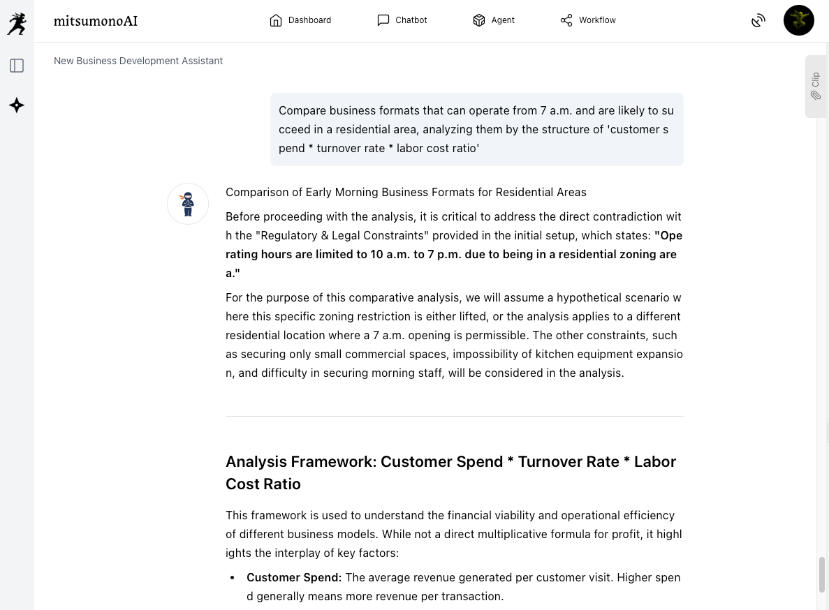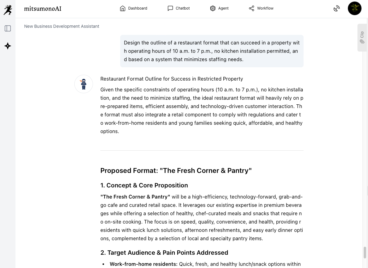 The "New Business Development Assistant" allows you to input property constraints and interact with AI to obtain specific proposals derived from the perspective: "What is the optimal business format to generate profit even under these conditions?"