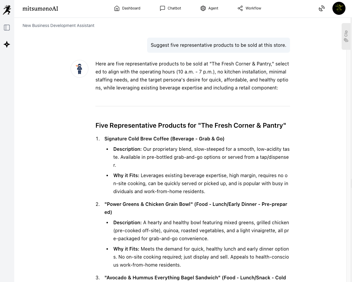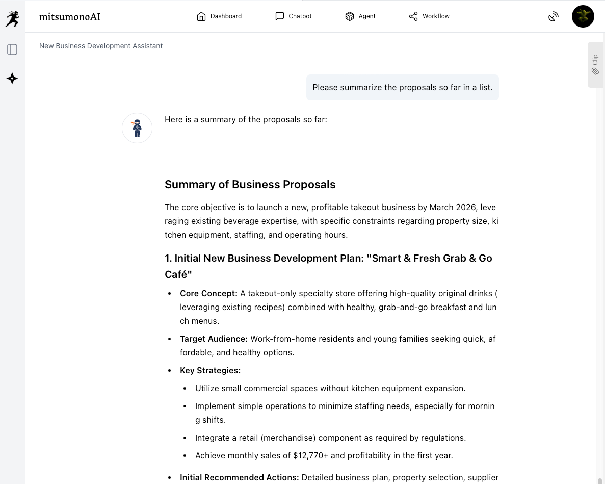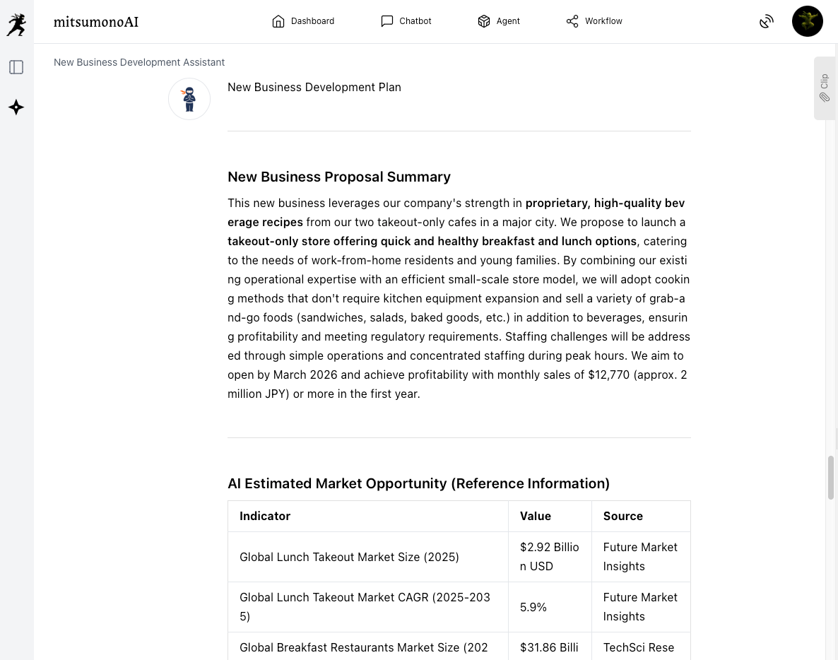 The "New Business Development Assistant" allows you to input property constraints and interact with AI to obtain specific proposals derived from the perspective: "What is the optimal business format to generate profit even under these conditions?"