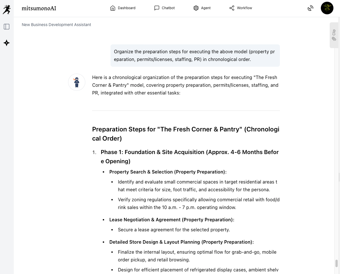 Prompt Example:"Output a summary of the key points for this business model in a single A4 landscape page proposal format (include overview, products/services, target customers, revenue structure, initial costs, and constraints, etc.).""Organize the preparation steps for executing the above model (property preparation, permits/licenses, staffing, PR) in chronological order."