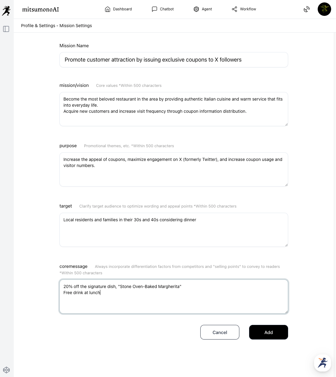Create a Mission to clearly communicate the purpose and target of the coupon. (e.g., set a specific goal such as "Boosting traffic by issuing a coupon exclusive to X followers.")