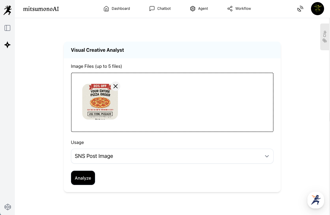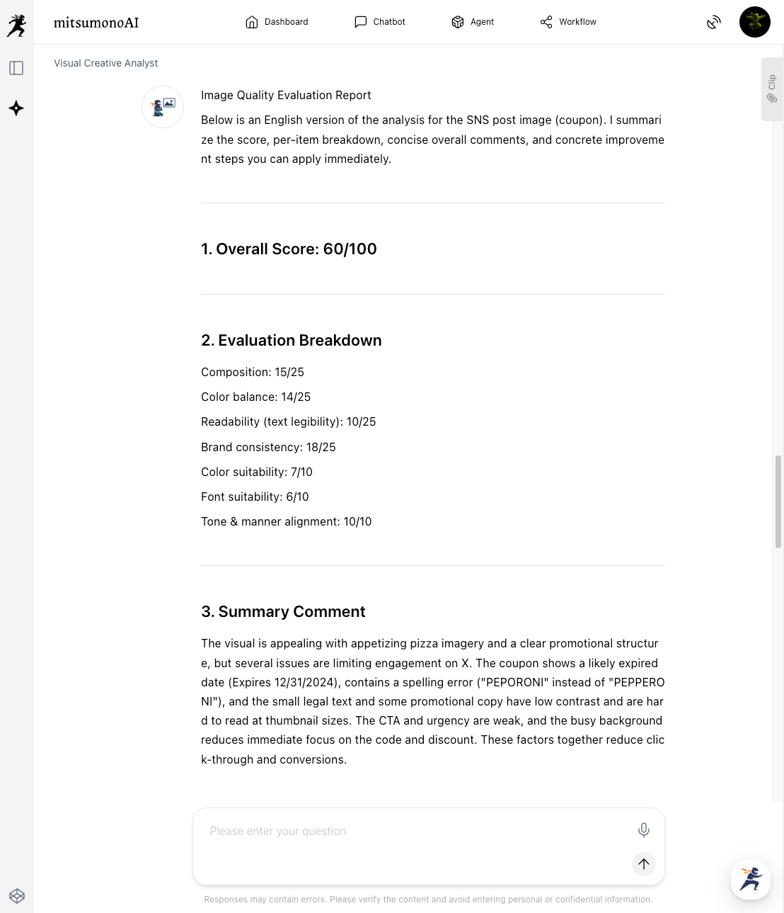 First, analyze whether there are issues with the image, which is the key to attracting customers. Upload your prepared coupon image to the "Visual Creative Analyst" to obtain general analysis results.