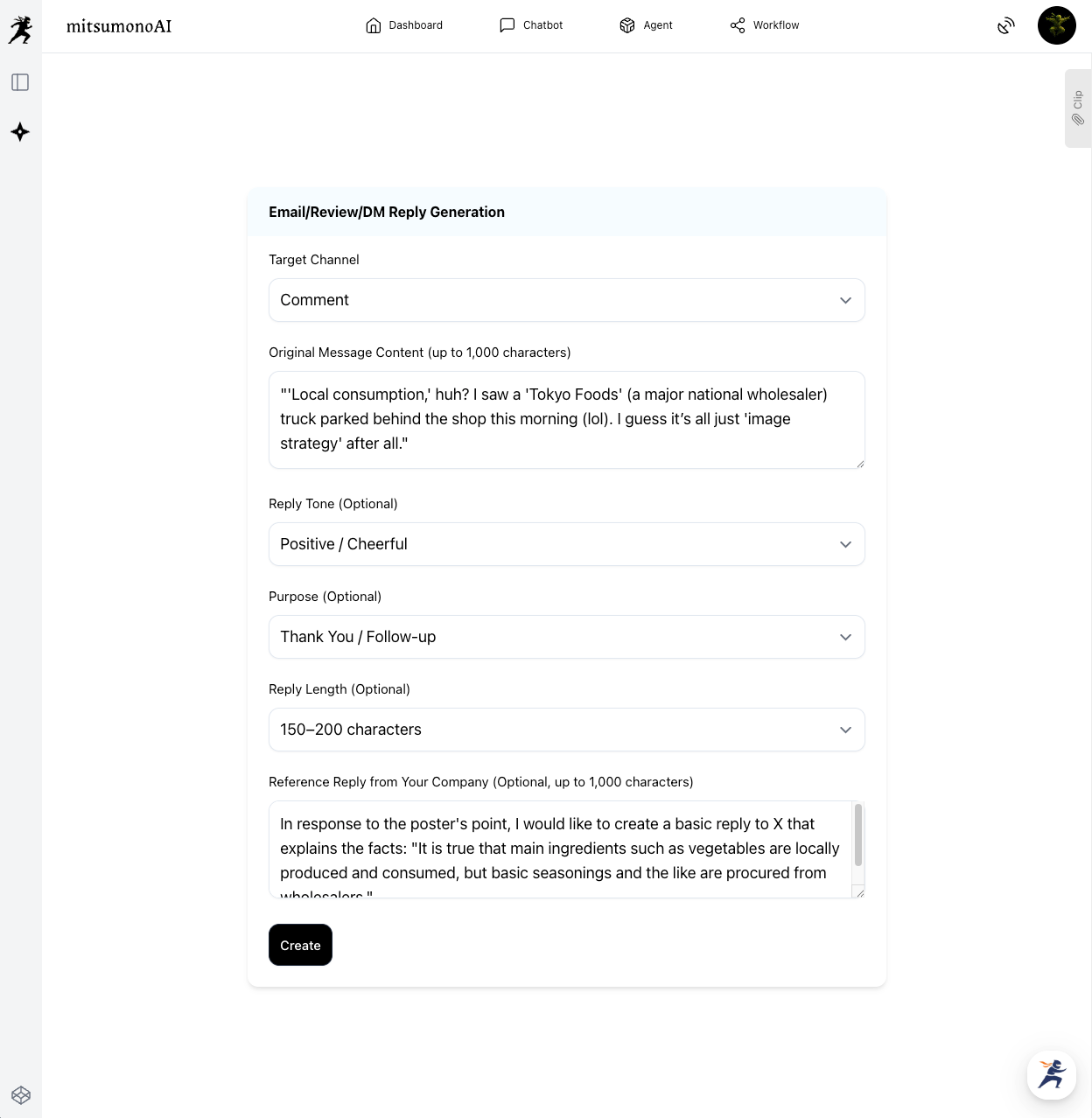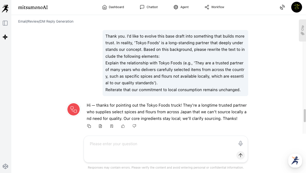 First, use the "Email/Review/DM Reply Creation" tool to generate an initial draft. The goal here is not to create the final version immediately, but to get a "working draft" from the AI that focuses on explaining the facts calmly.